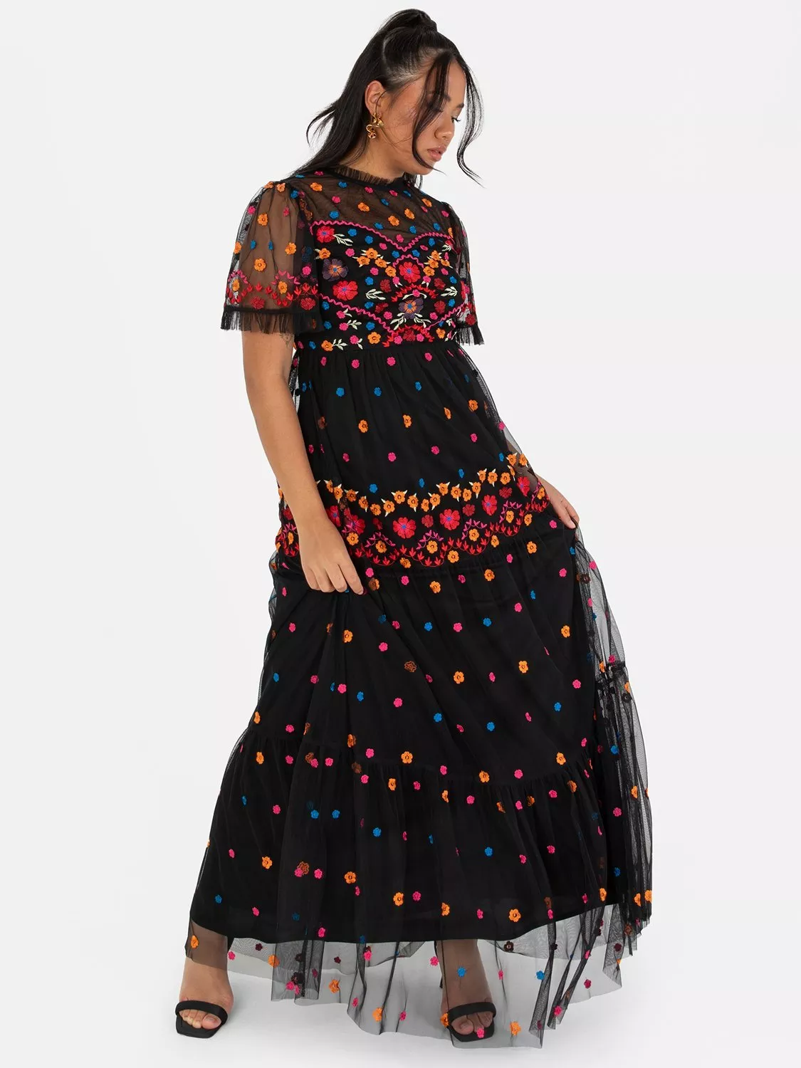 Crafted with meticulous attention to detail, ensuring that each stitch unveils a captivating story. The neckline lining is adorned with romantic tulle fabric gracefully extending into a luxurious yoke bodice with sheer short sleeves with frill detailing. The ethereal charm is heightened by the bright embroidery, where a precisely stitched floral pattern graces the bodice sleeves and midi skirt. Whether you're attending a special event a romantic dinner or a formal gathering style this midi dress with black strappy heels for a classic evening look or opt for a pop of colour for a daytime event.