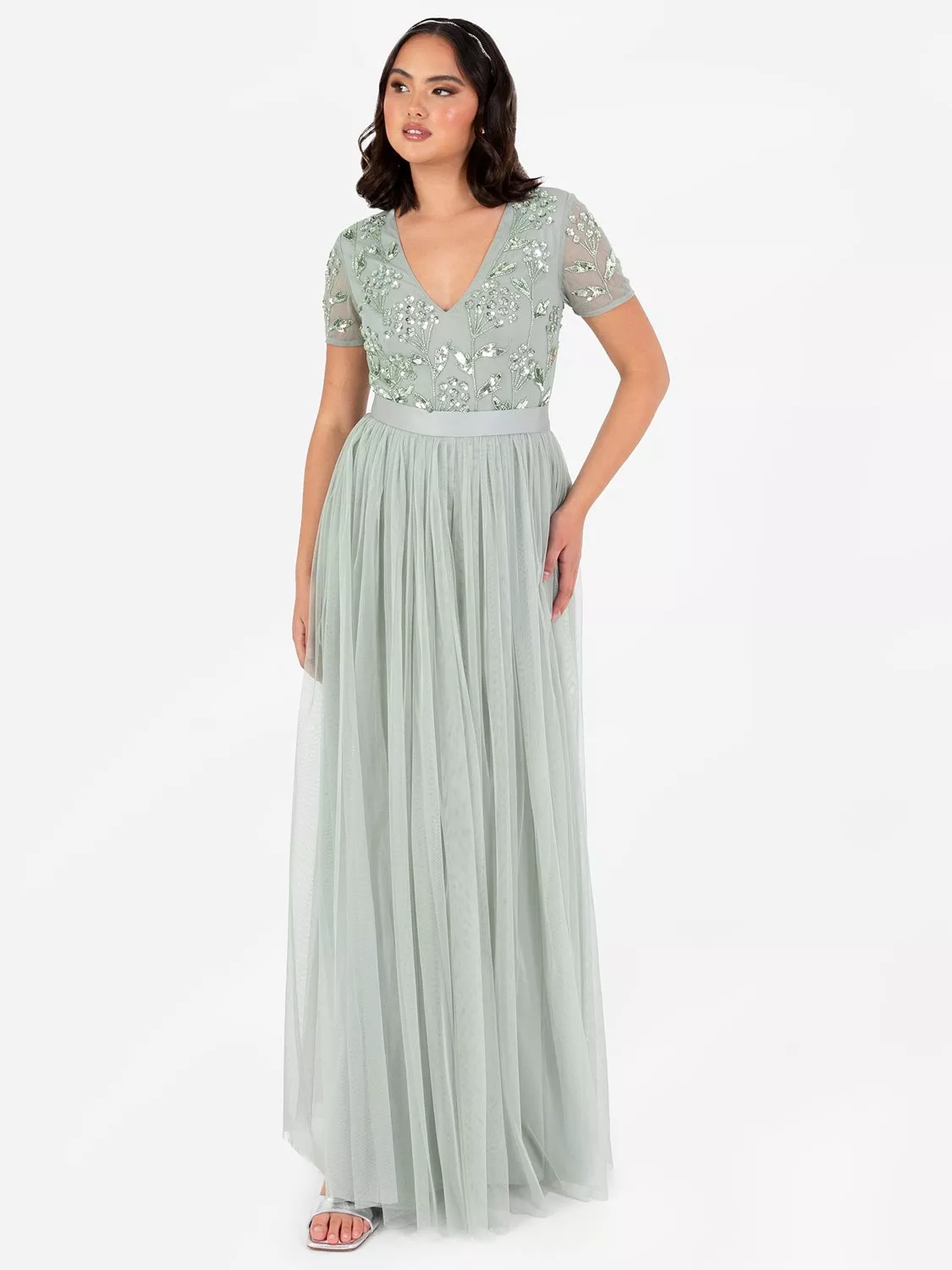 Make a memorable impression in this glamorous piece from Maya Deluxe. Meticulously placed sequin and beads form floral motifs that elegantly adore the V neck bodice and sheer short sleeves. Tulle fabric continues to fall into an A-line shaped maxi skirt that’s comfortable for all body shapes making this dress an ideal choice for a bridesmaid ensemble. Complete the look by pairing this floor-sweeping dress with barely-there heels and dainty earrings.