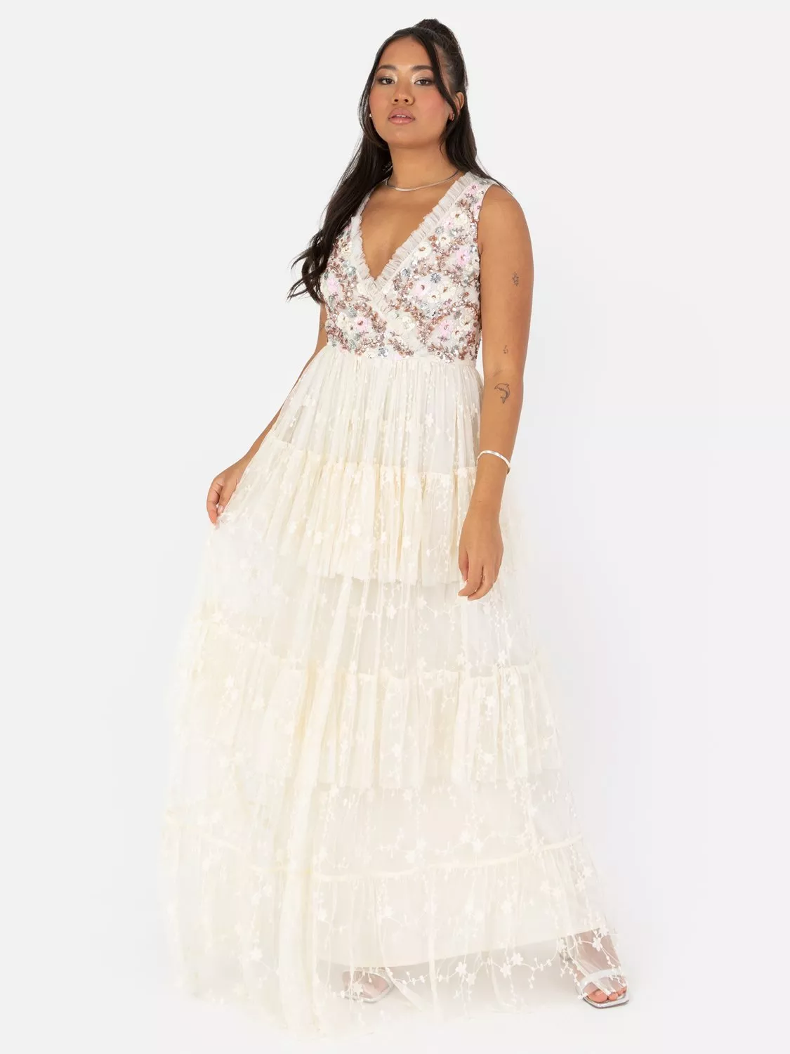 Maya's designers have reached new heights with a blend of textures and intricate detailing showcased on this sleeveless maxi dress. The bodice became a work of art with lavish floral motifs that sit atop the faux wrap sleeveless bodice which is also detailed with charming frill tulle. Contrasting the bodice the delicately layered maxi skirt offers a light movement and the embroidered ecru accents further the sophisticated yet charming look.