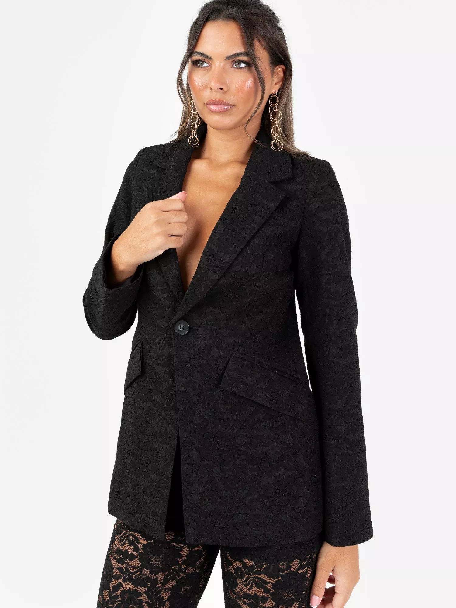This statement blazer features a delicate floral lace overlay, with a notched lapel, single-breasted closure, flap pockets, and a cinched waist for a flattering silhouette.