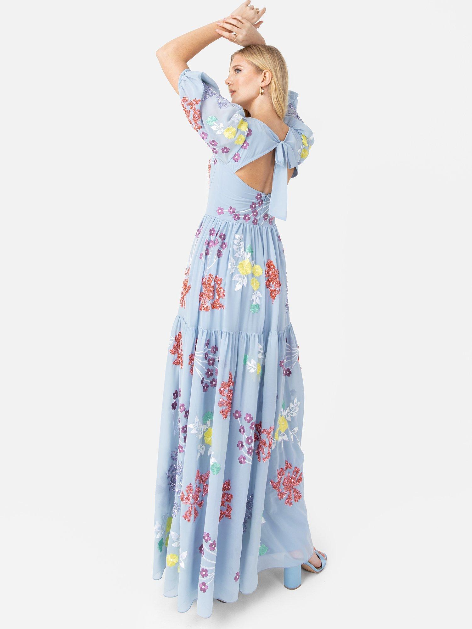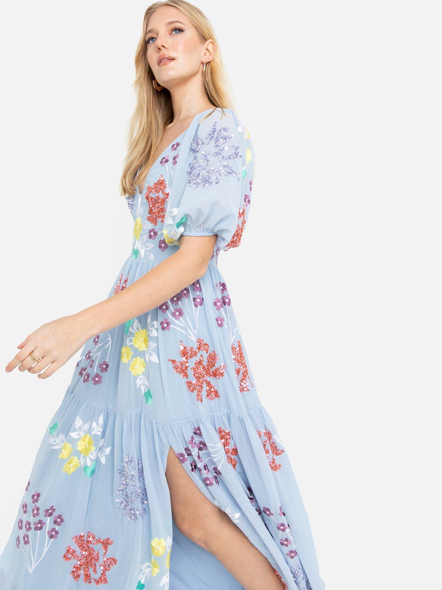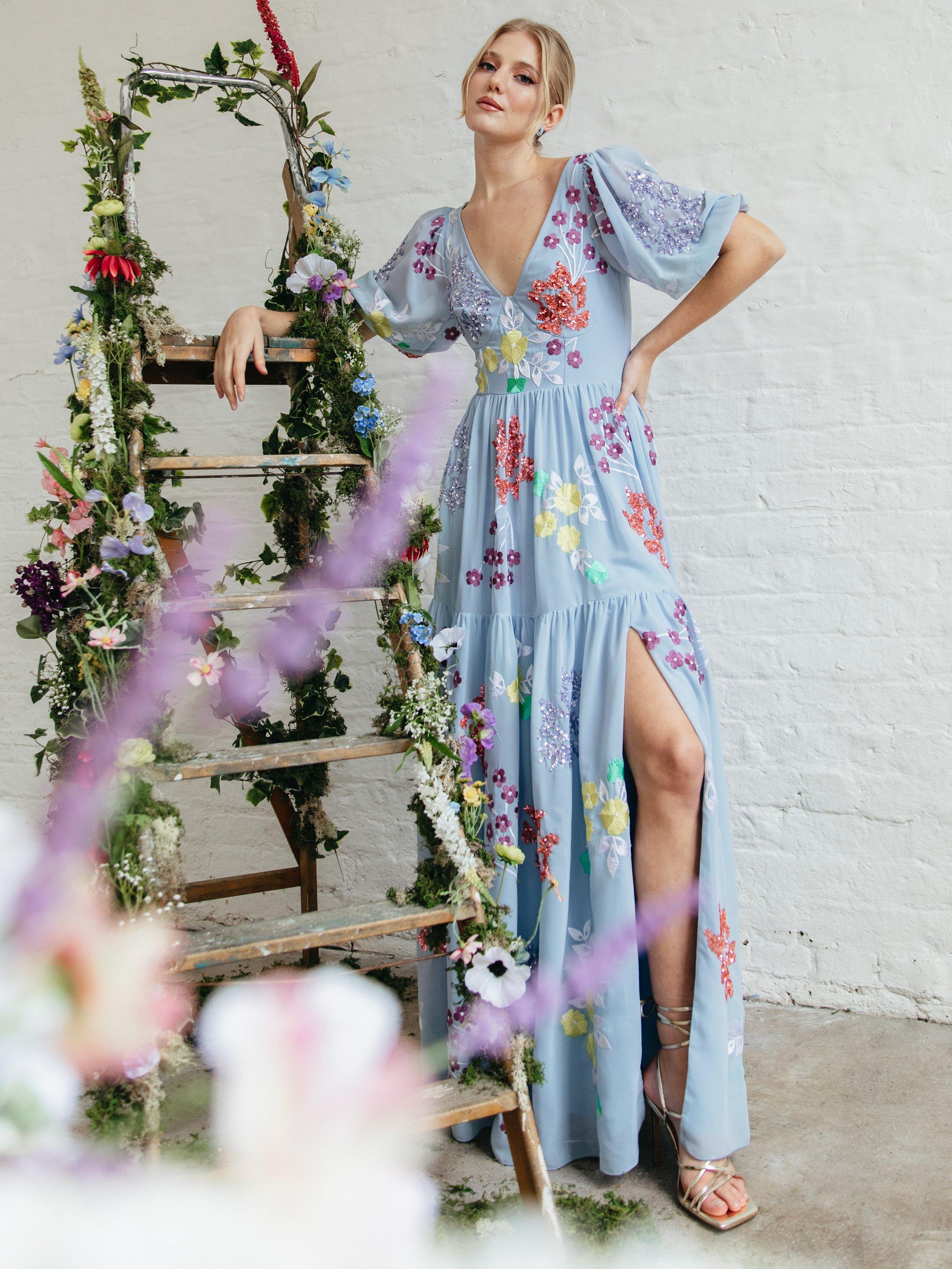 Upgrade your summer events repertoire with this floral maxi. Crafted on a summery base the A-line silhouette of this maxi is elevated by the mesmerising floral embroidery and sequin embellishment that runs from the puffed short sleeves and cupped bodice down to the thigh split skirt. Side slip on the skirt adds plenty of movement so you can stroll through the event with style.