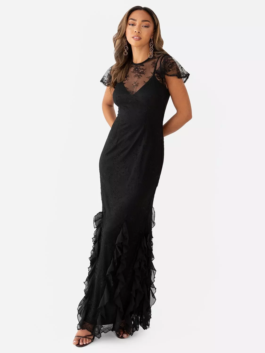 Every detail is thoughtfully designed to highlight your natural charm—from the romantic lace overlay that forms delicate flutter sleeves and a round neckline, to the cami-style lining that adds subtle sophistication. The flattering fit-and-flare silhouette is brought to life with cascading waterfall ruffles that add movement and elegance to the skirt. Complete the look with strappy heels and shimmering jewellery for an effortlessly romantic ensemble.
