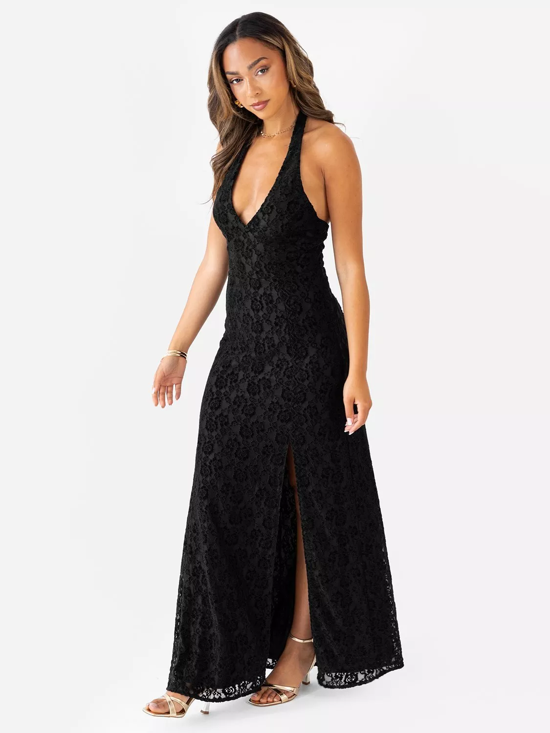 Crafted from richly textured floral velvet, this dress whispers of opulence while embracing a confidently minimalist silhouette. A plunging V-neckline frames the décolletage, artfully shaped by a self-tie halter that fastens into a soft bow at the nape of the neck, revealing a daring open back. The fitted bodice flows into an A-line skirt that skims the floor, while a daring side split reveals a hint of leg with every step. Style this floral dress with gold accessories and Hollywood-style curls for an effortlessly glamorous finish.