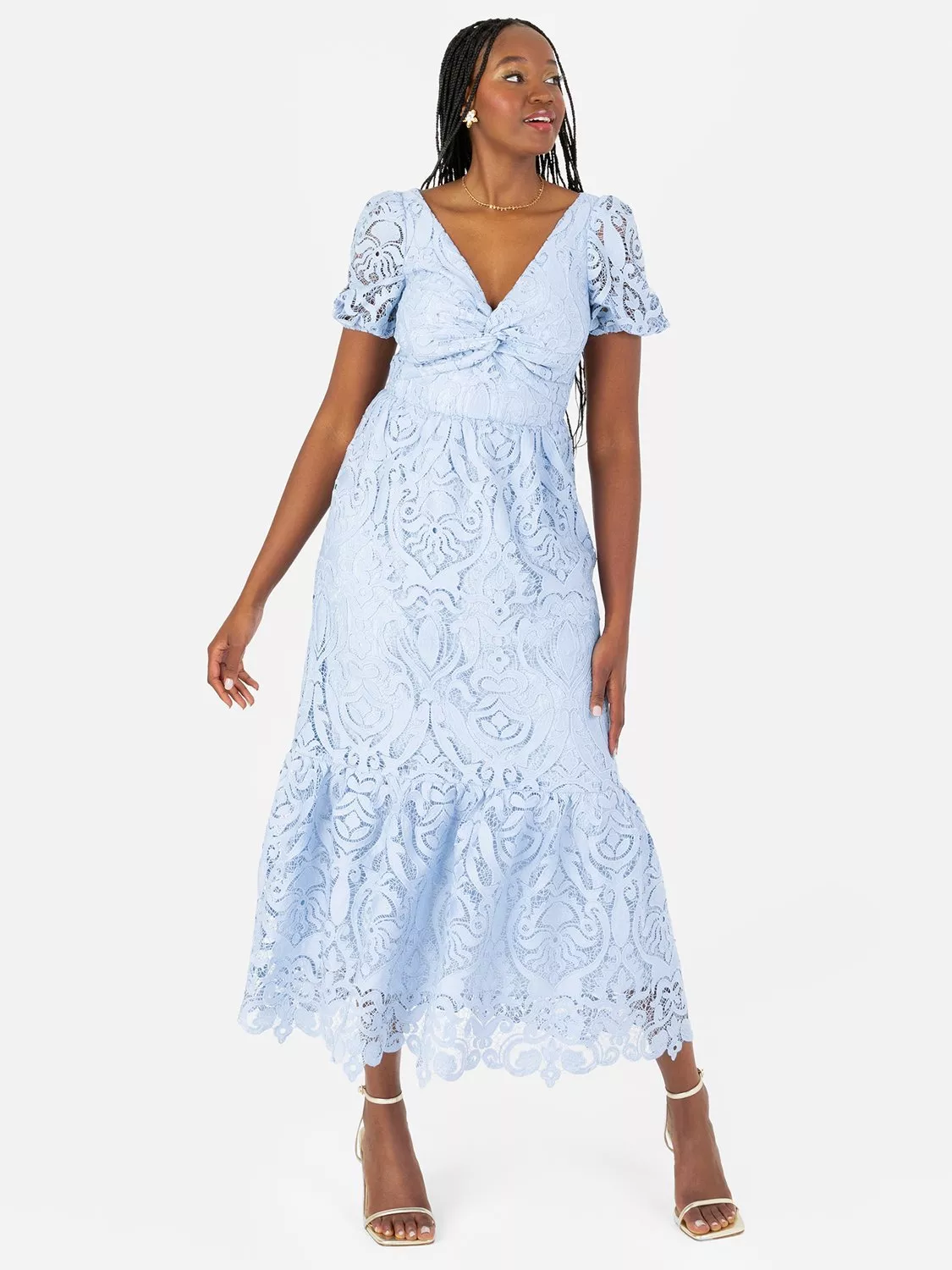 Let this elegant lace dress take centre stage in your occasion repertoire. Imagined in a light blue hue this midi is complemented by sheer short sleeves and a charming V neckline with a twist detail at the base. A cinched waist accentuates the figure allowing the skirt to fall with a ruffled hemline for a blend of fun and sophistication. Style this midi dress with gold accessories for a pop of shimmer.