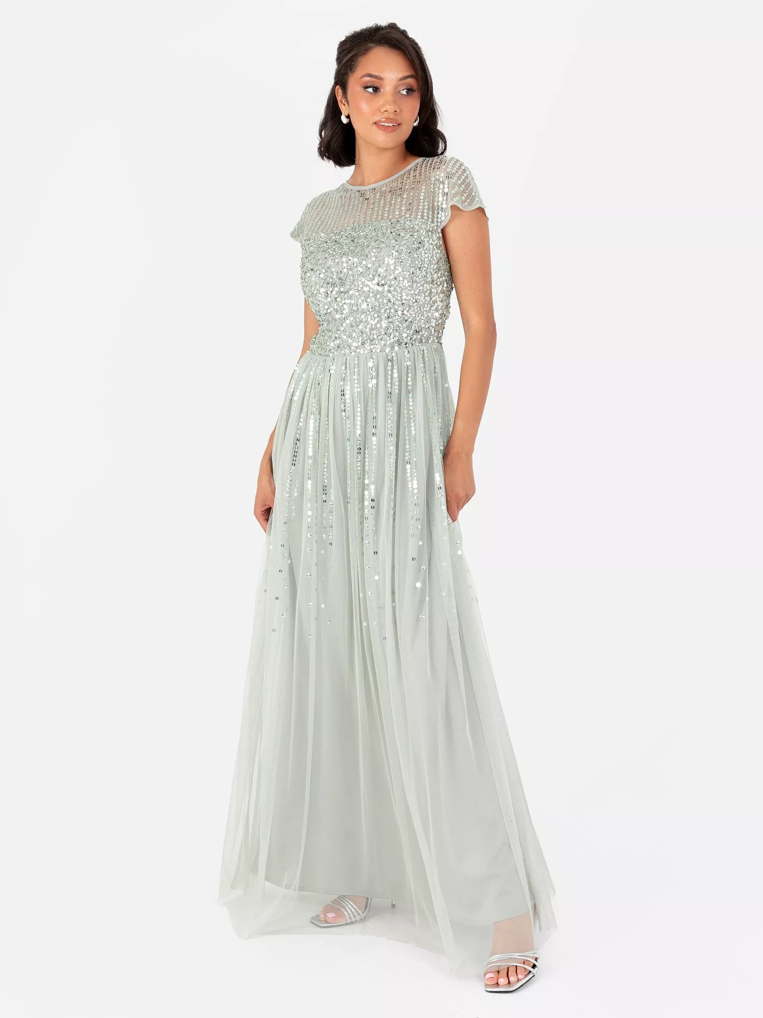 This dress is destined to be your go-to choice for making a lasting impression. The design showcases delicate cap sleeves crafted from a sheer yoke, adorned with linear sequin embellishments, and a dainty keyhole detail at the back, while rest of the fitted bodice is drenched with more sequin and bead embellishments. Flowing tulle maxi skirt mirrors the linear cascading sequin design for a harmonious yet captivating look. Style with silver accessories.
