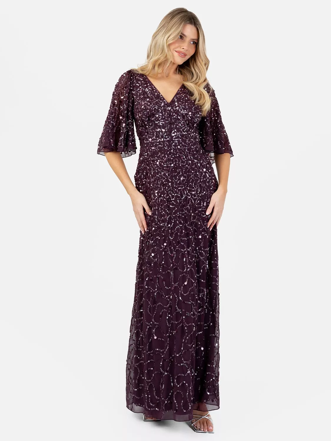 Maya DeluxeSequin Angel Sleeve Maxi Dress, Berry/Silver