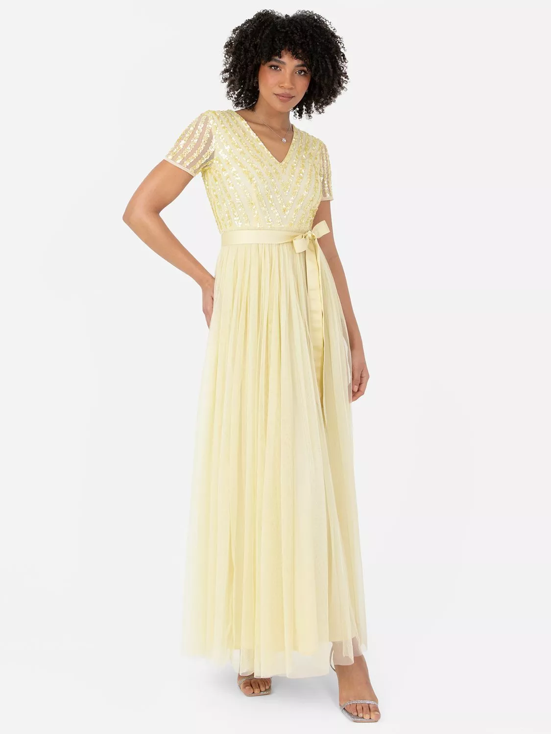 At the heart of this dress lies a meticulously arranged stripe embellishment that follows the lines of the classic V Neckline and strikes contrasting angles on the sheer short sleeves. A-line shape is crafted from delicately draped tulle fabric forming a flattering silhouette while the satin sash belt sitting atop the waist adds a charming finishing touch and further accentuates the figure.
