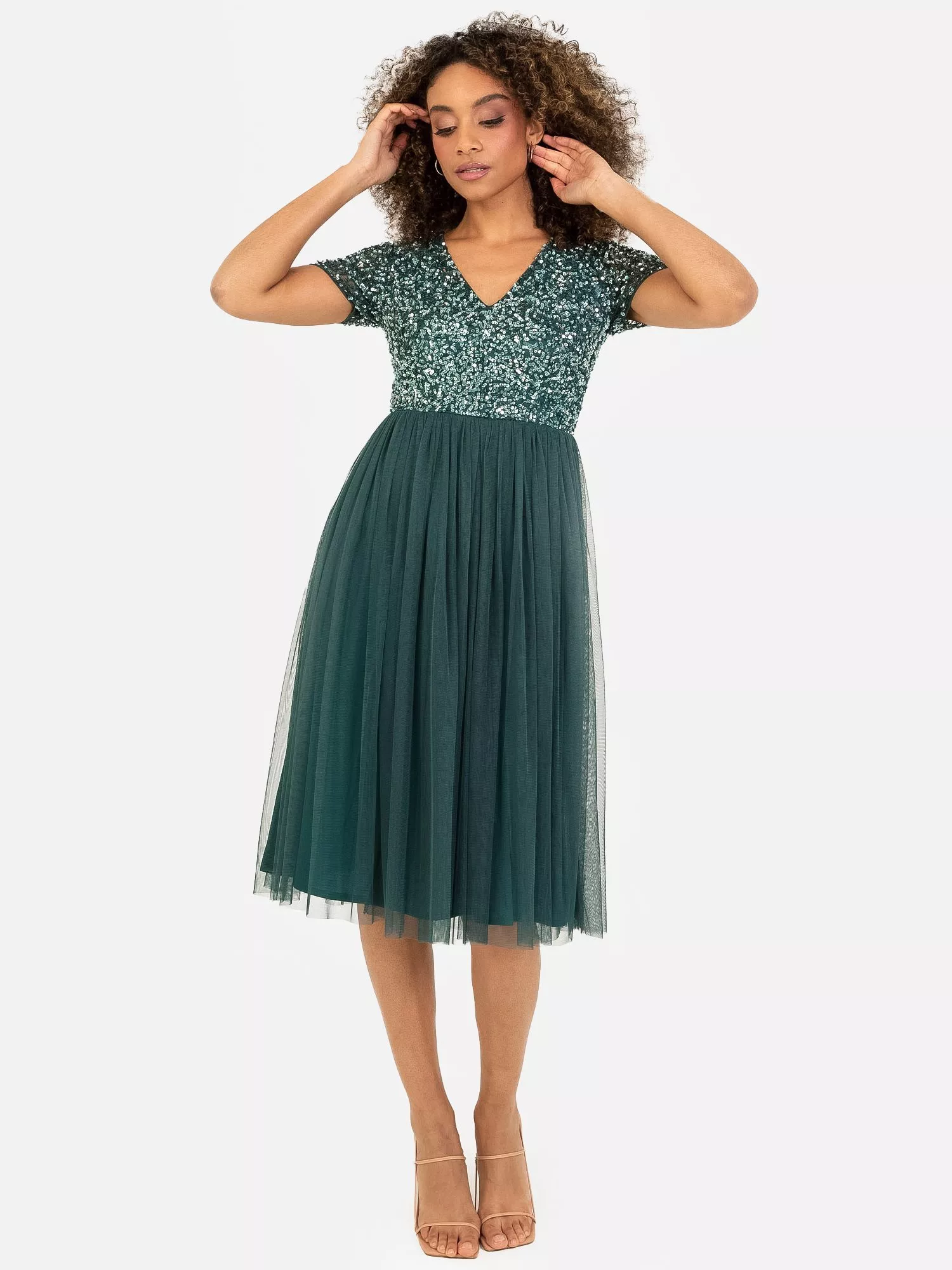 With a little twist on our most popular bridesmaids dress this midi version is a perfect choice for summer weddings. Maya's adored hand-sewn sequin and bead embellishment over the fitted bodice gives this dress enough sparkle to twinkle at the altar, and the soft tulle skirt flowing from the cinched waist complements the figure with its A-line shape.