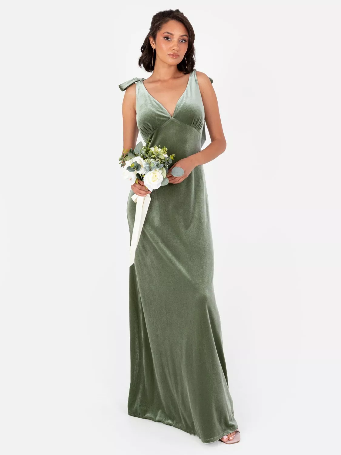 Designed for a customisable fit, the self-tie straps tie into delicate bows, complementing the classic V-neckline, while the empire waist and gently ruched bust introduce a hint of romance. The A-line silhouette of the maxi skirt gracefully flares at the hem, flattering the figure with each step. Pair this comfortable velvet maxi dress with strappy heels and shimmering accessories for an effortless look.