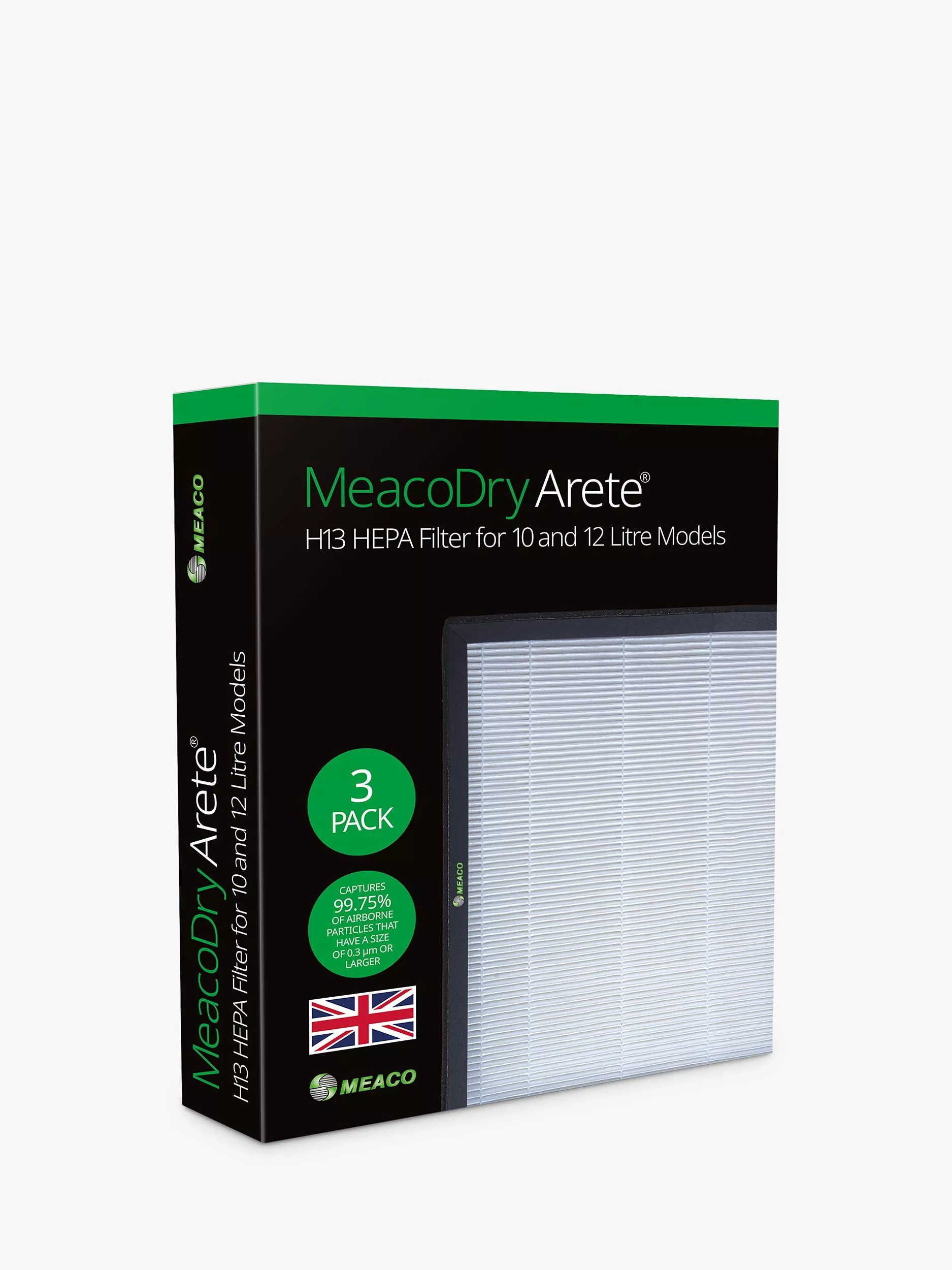 A set of 3 medical-grade H13 HEPA filters compatible with the MeacoDry Arete® One and Two 10L and 12L Dehumidifiers and Air Purifiers for cleaner air in your home, with 99.95% retention of particles as small as 0.3 micrometers in diameter. These high-efficiency HEPA filters will help against allergies and irritations. HEPA filters should be replaced when the colour changes from white to dark grey - roughly every 3 months.