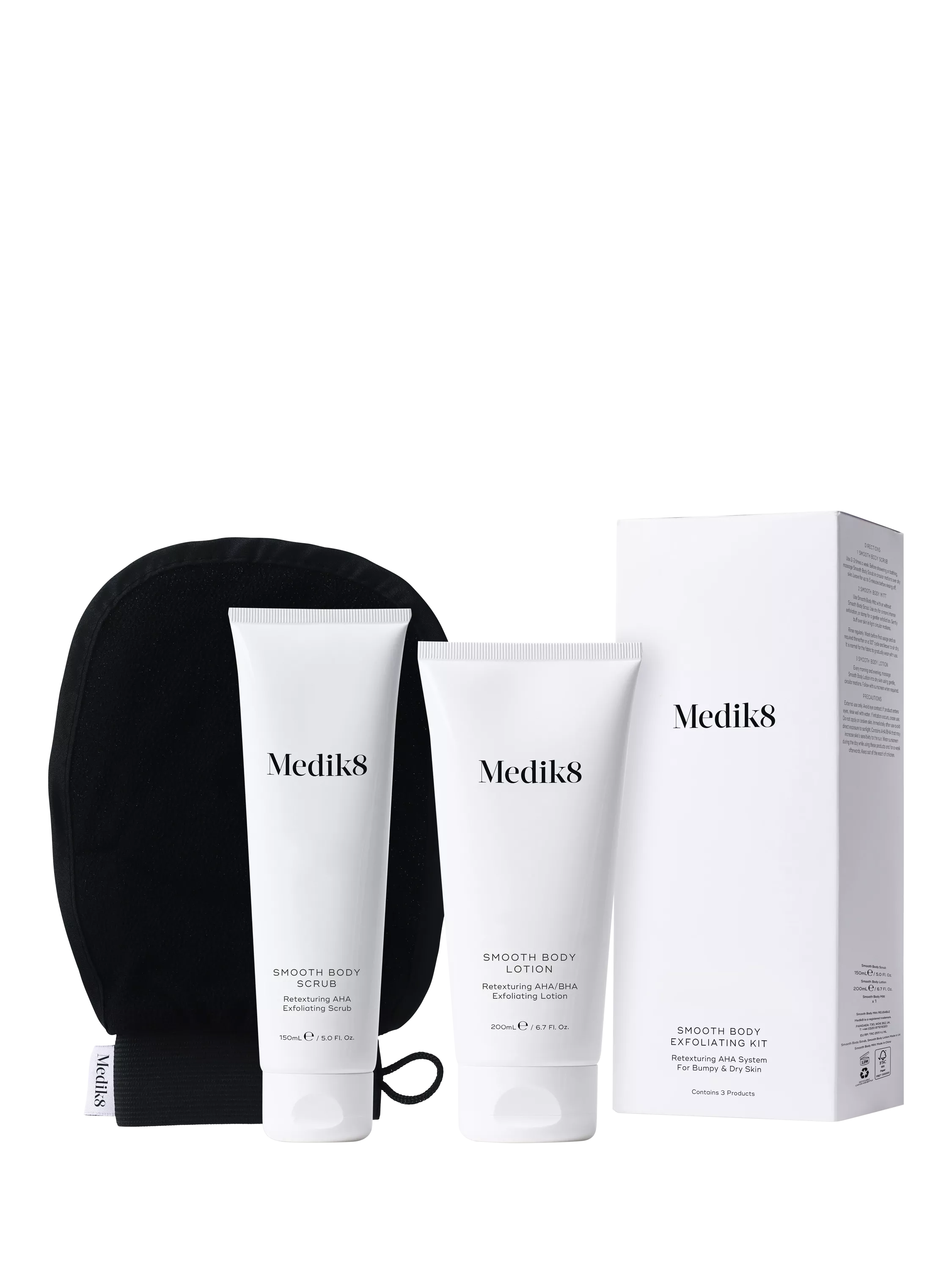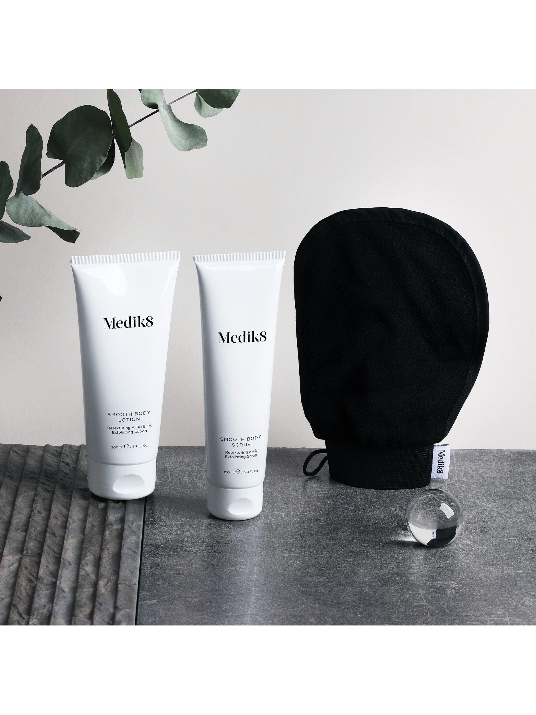 Instantly revitalise the look and feel of rough, dry or bumpy skin with Medik8's 3-step Smooth Body Exfoliating Kit.