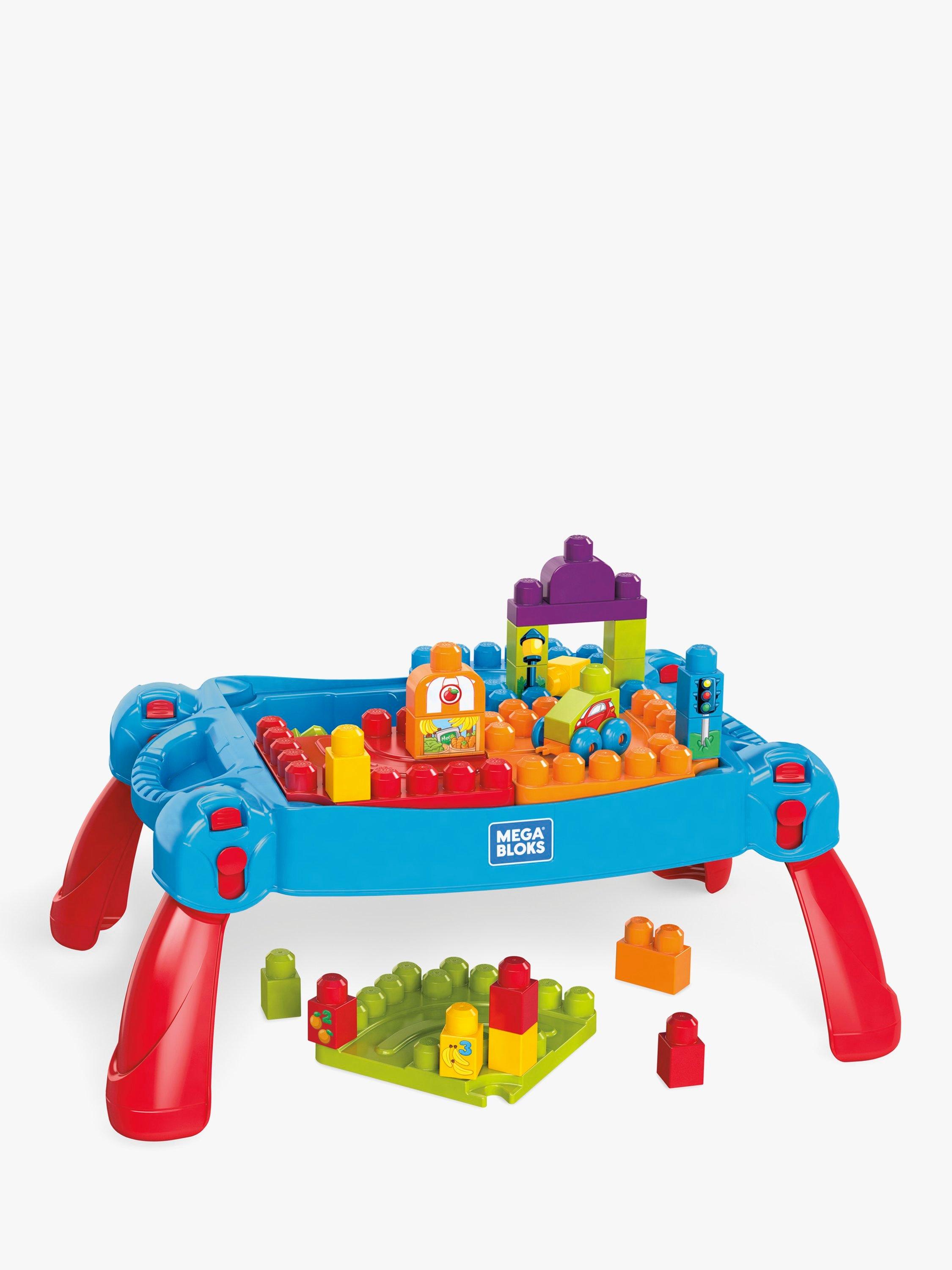 The table comes with four fun scenes, stickers, a figurine, a car and 30 big plastic colourful Mega Bloks.