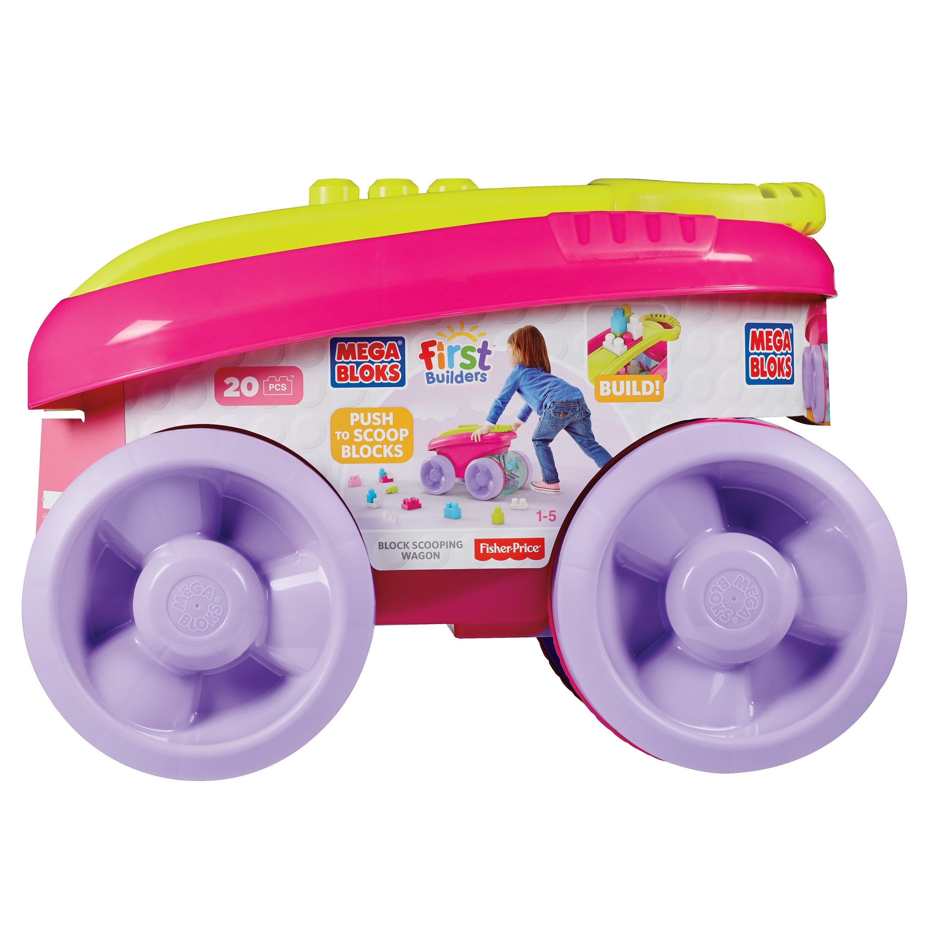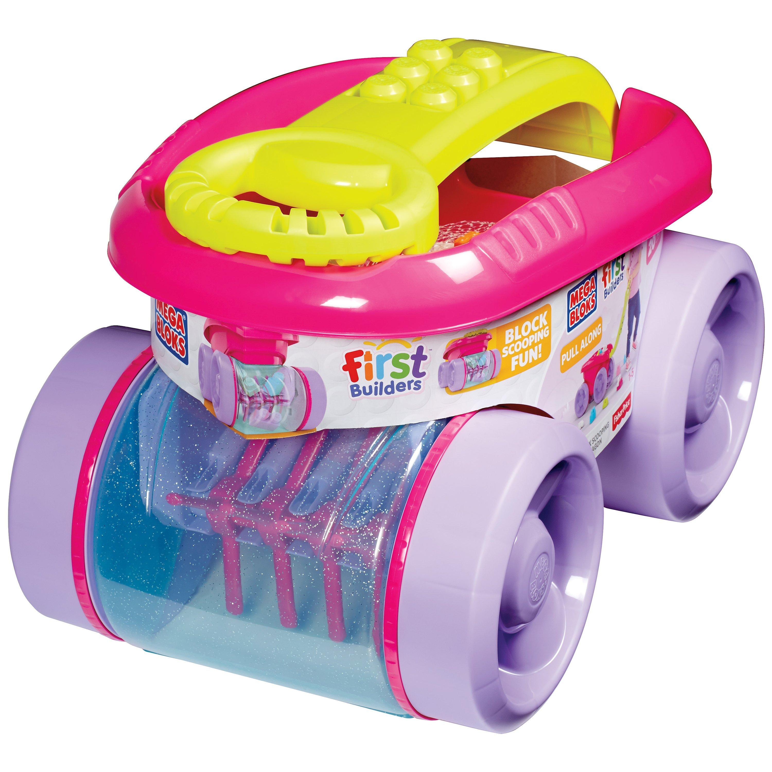 The Mega Bloks First Builders scooping wagon is a clever combination of pulling/pushing play and construction. Toddlers can pull with the handle or push the big yellow wheels along and see the wagon scoop up any loose blocks.