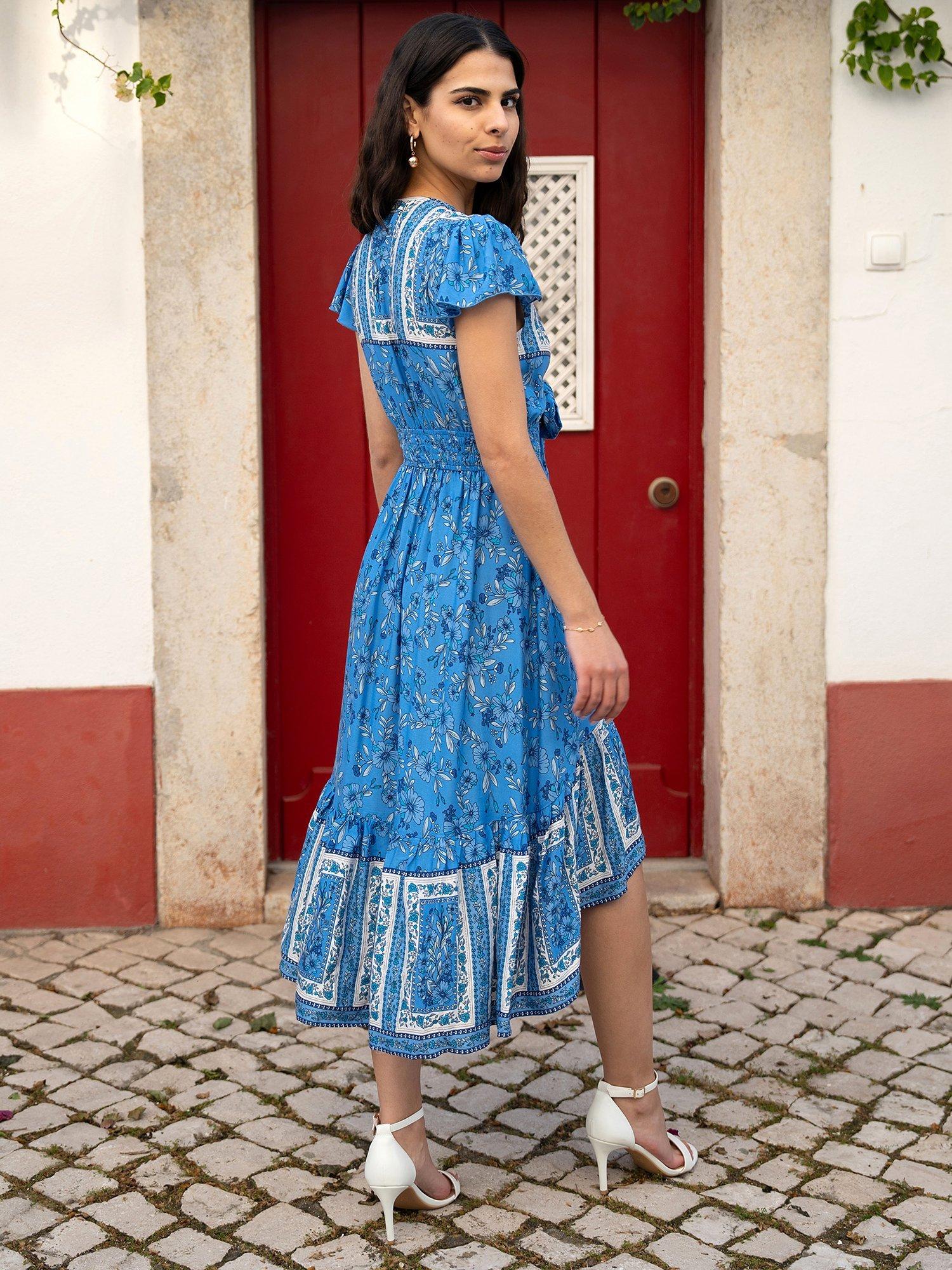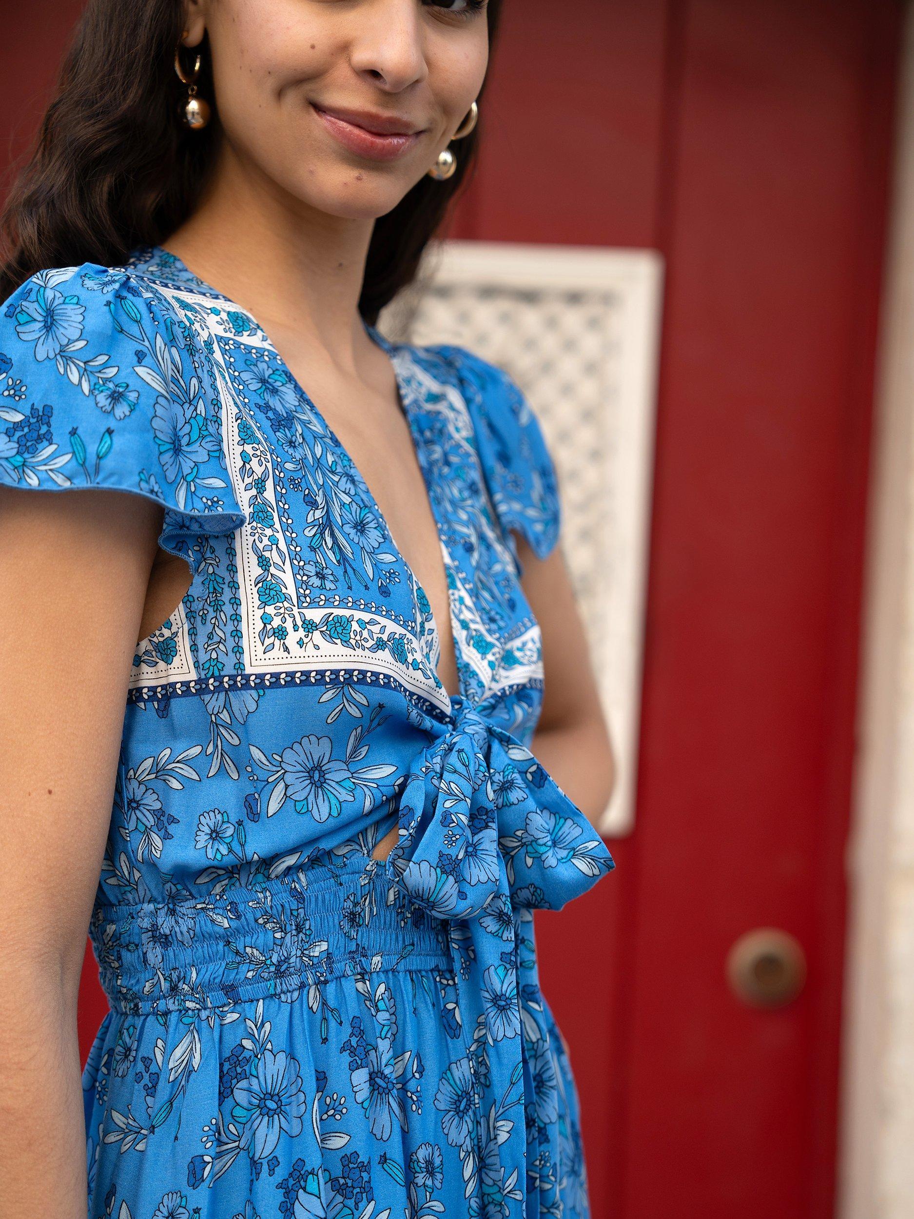 YumiMela London Ditsy Print Midi Sun Dress, Blue