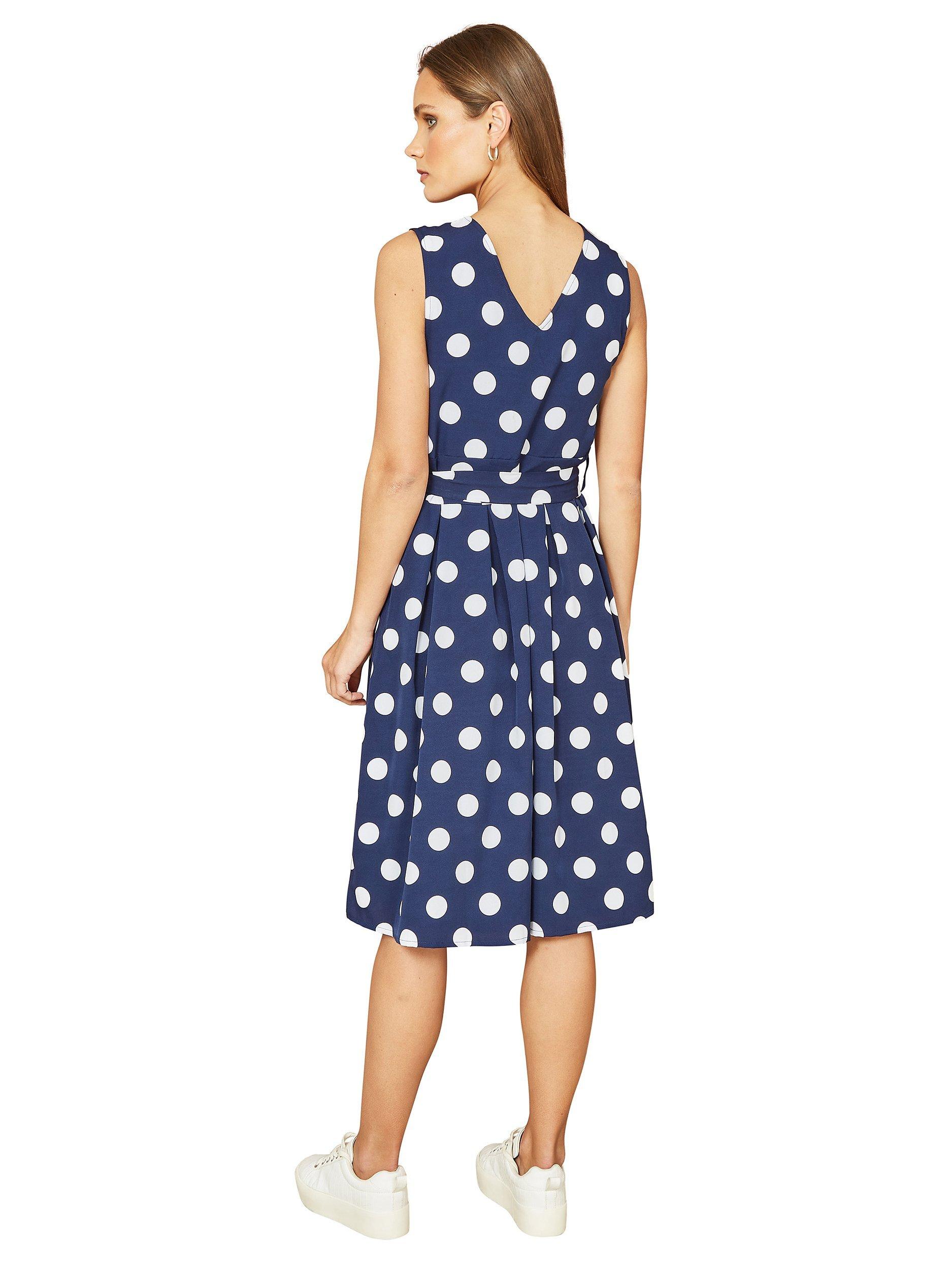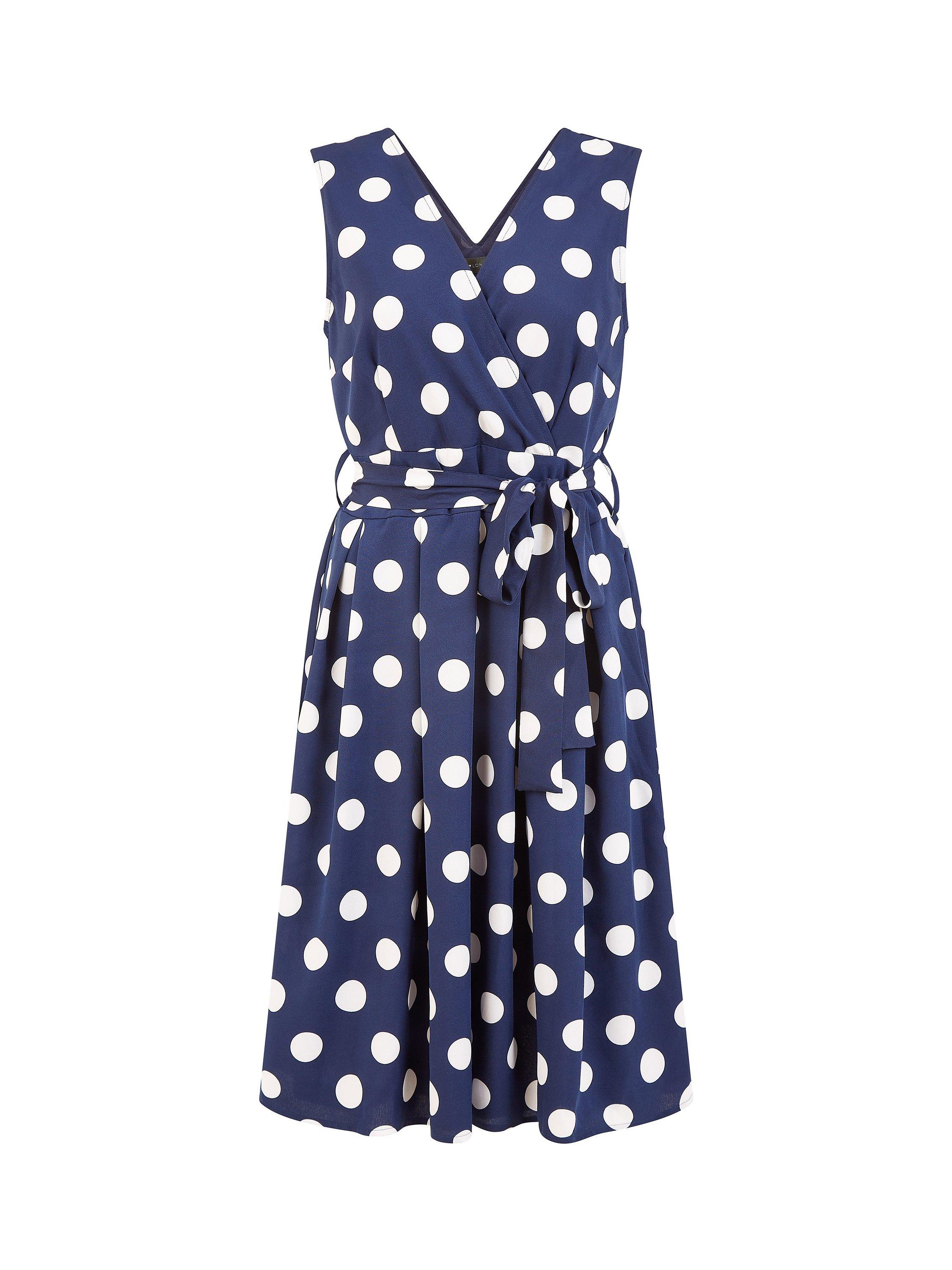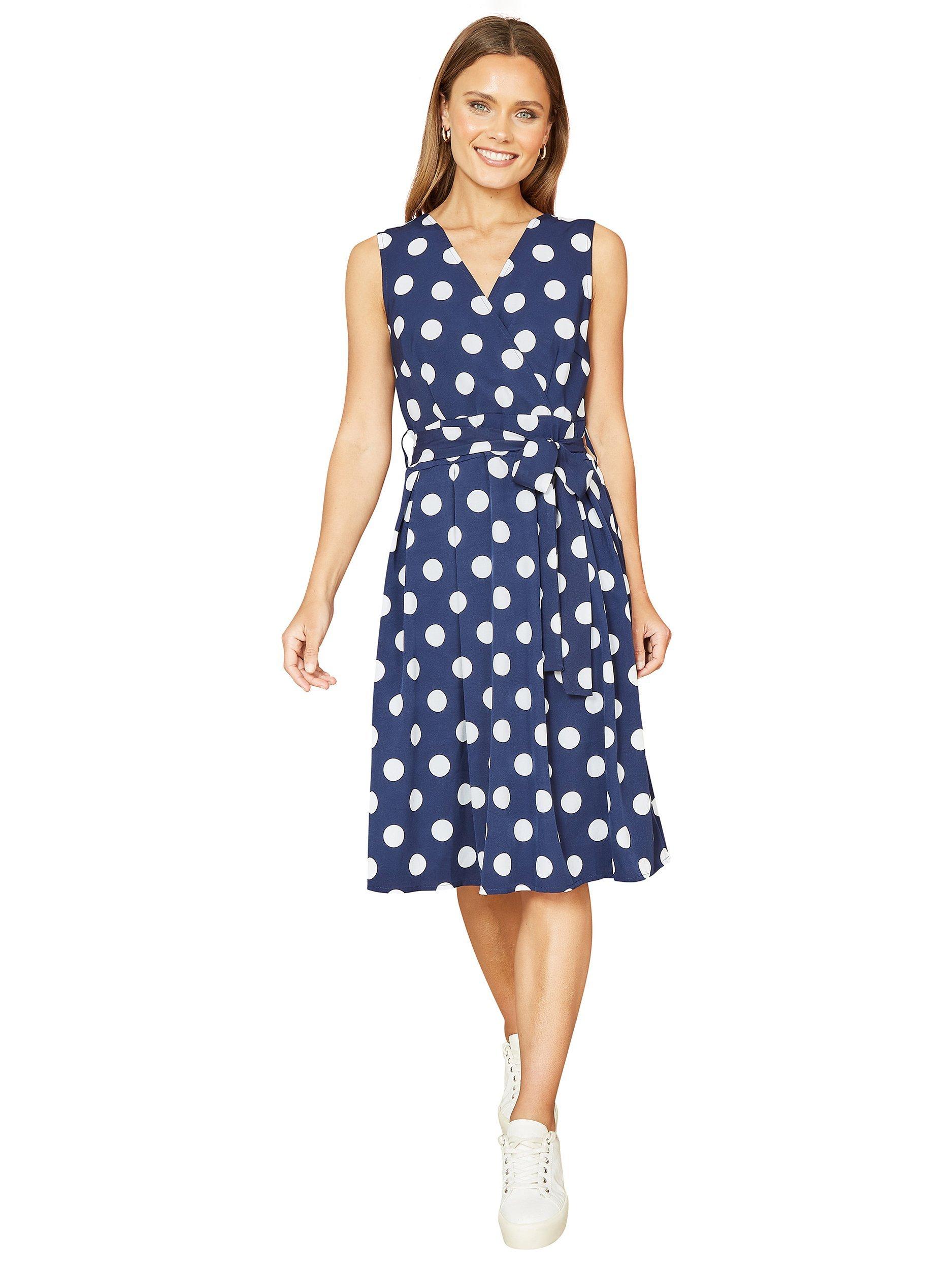 With an emphasised wrap-around silhouette, this mid-length dress from Yumi is made from a lightweight fabric. A classic option thanks to the wrap over neckline, this sleeveless style is brought to life with contrasting spots.