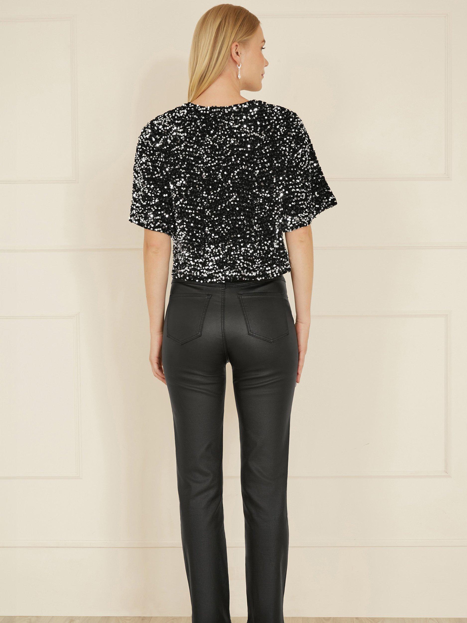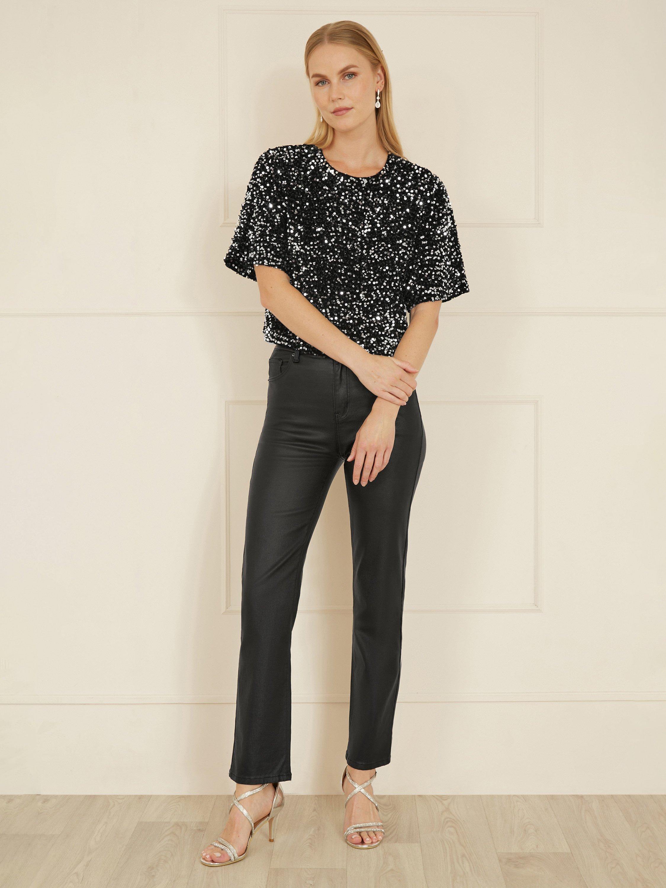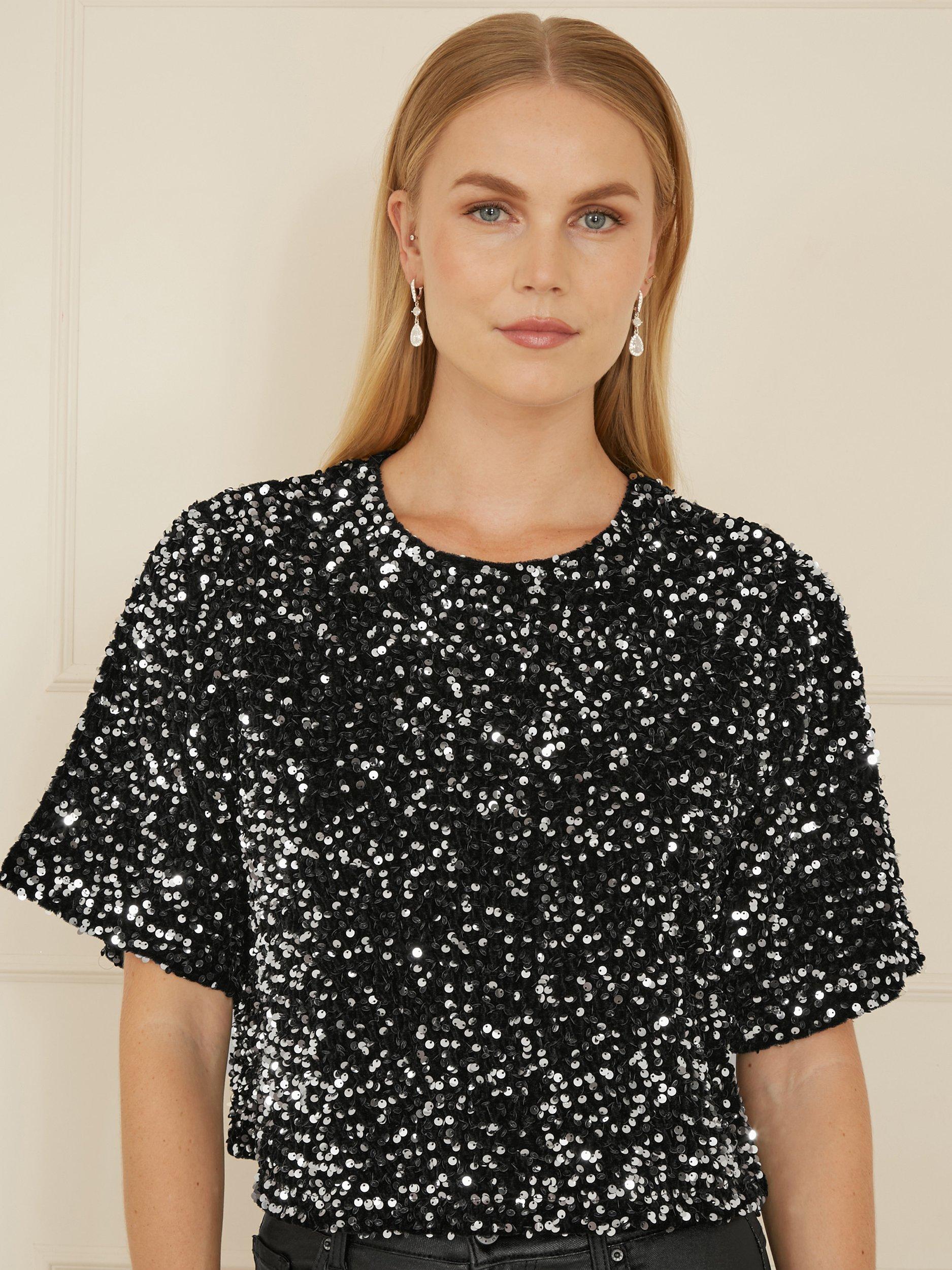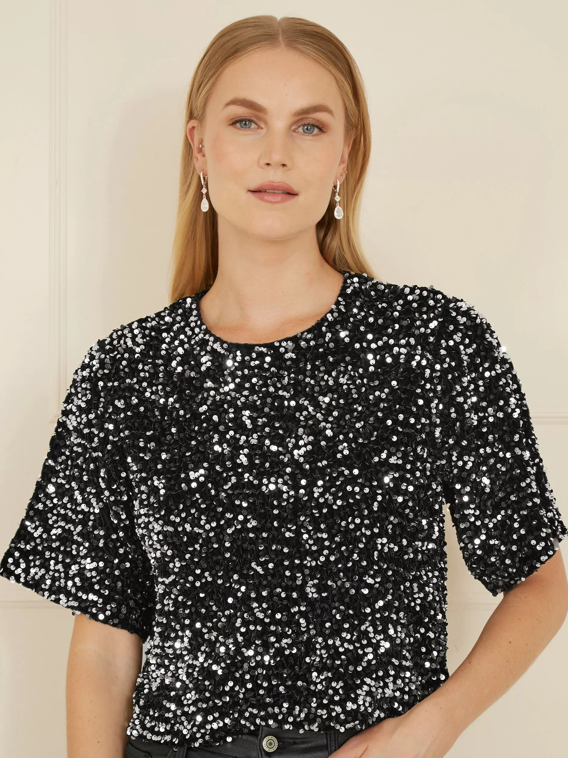 Sparkle time all round for the new season in this cute t-shirt style for a versatile fit. In all over sequins, in a simple cut we love this styled with jeans or a leather skirt for any invite - it looks stunning in dimmed light.