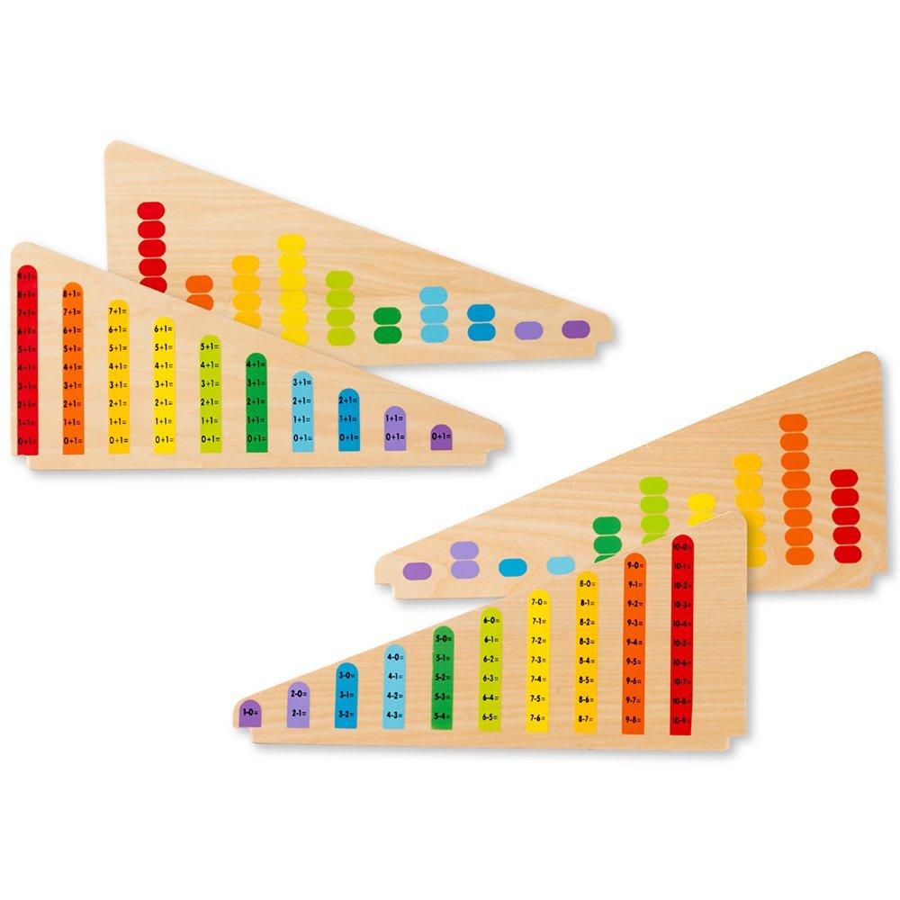 Just slide the two double-sided wooden boards into the base and kids will be all set to solve equations by lining up the correct number of beads on the addition and subtraction sides or follow the patterns on the colour-matching sides.