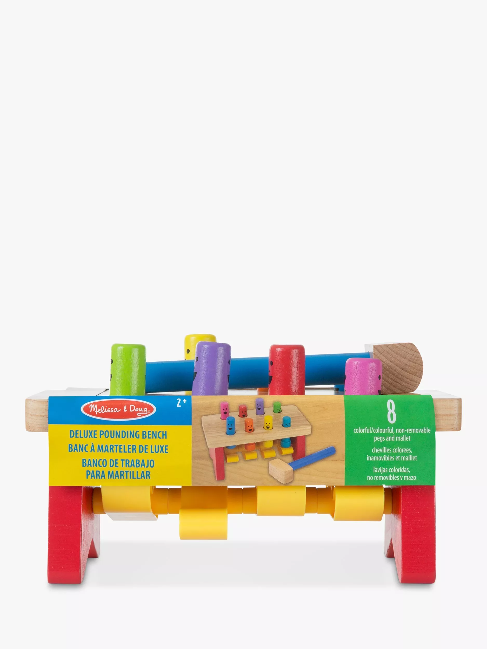 The pegs on the bench go up and down, playing peekaboo on this solid wood pounding activity toy from Melissa & Doug. Non-removable pegs take turns showing their smiles while your toddler has fun naming the colours and enjoys practising fine motor skills. A sturdy mallet is included.