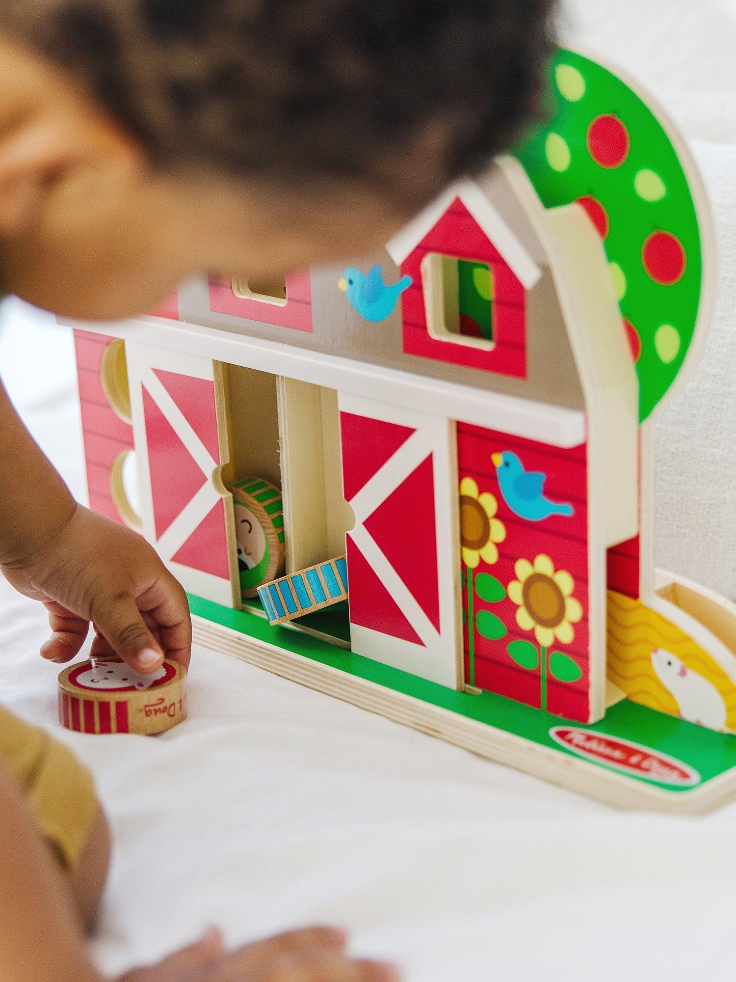 Let's go play on the farm with friends that are fun to roll, stack, and grasp! 4 double-sided chunky wooden GO Tots disks (8 collectable characters - 6 animals and 2 farmers) tumble and twirl down the silo, out the barn door, over the haystack, and into the trough.