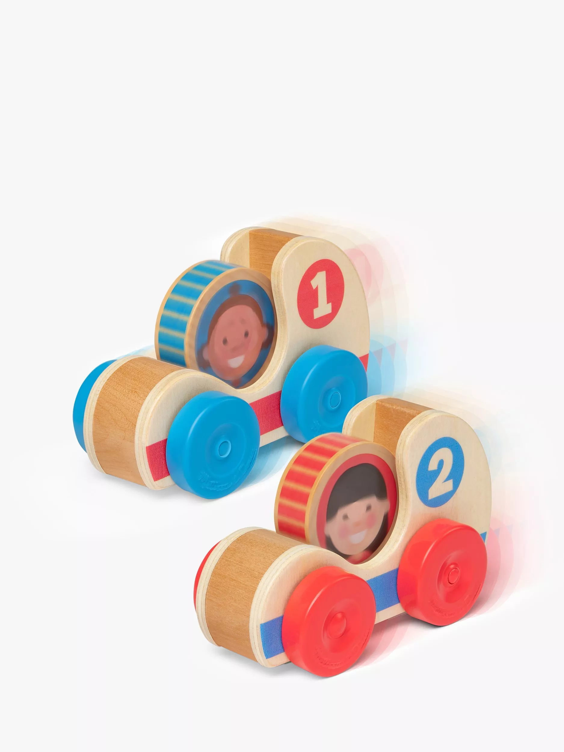 Have fun with your little one driving and zooming around with these wooden race cars. Featuring 2 discs with different characters on each side, they slot nicely into the cars and can be easily changed. They also spin around once the cars are pushed along. Teaches and hones in on fine motor skills and development.