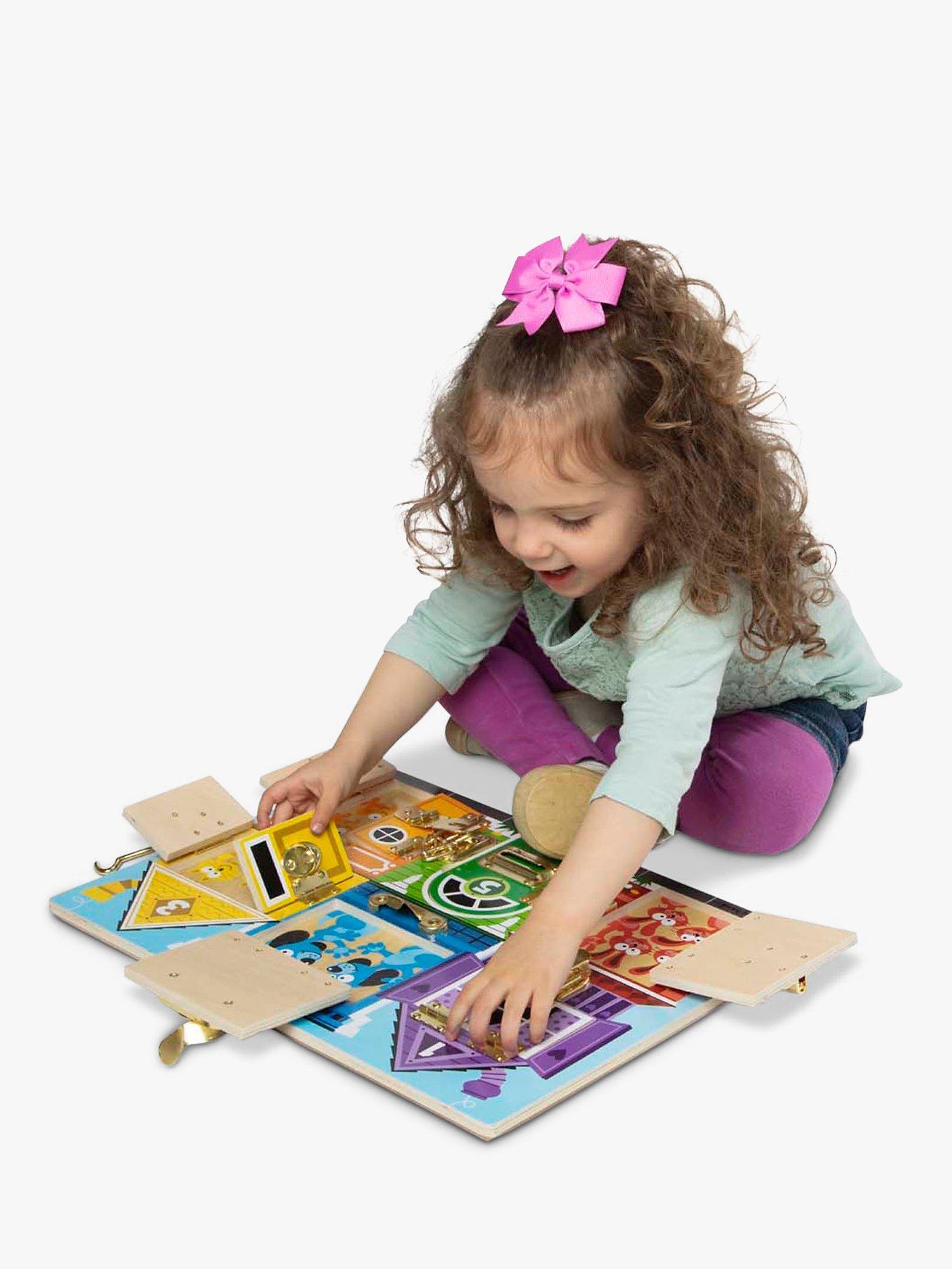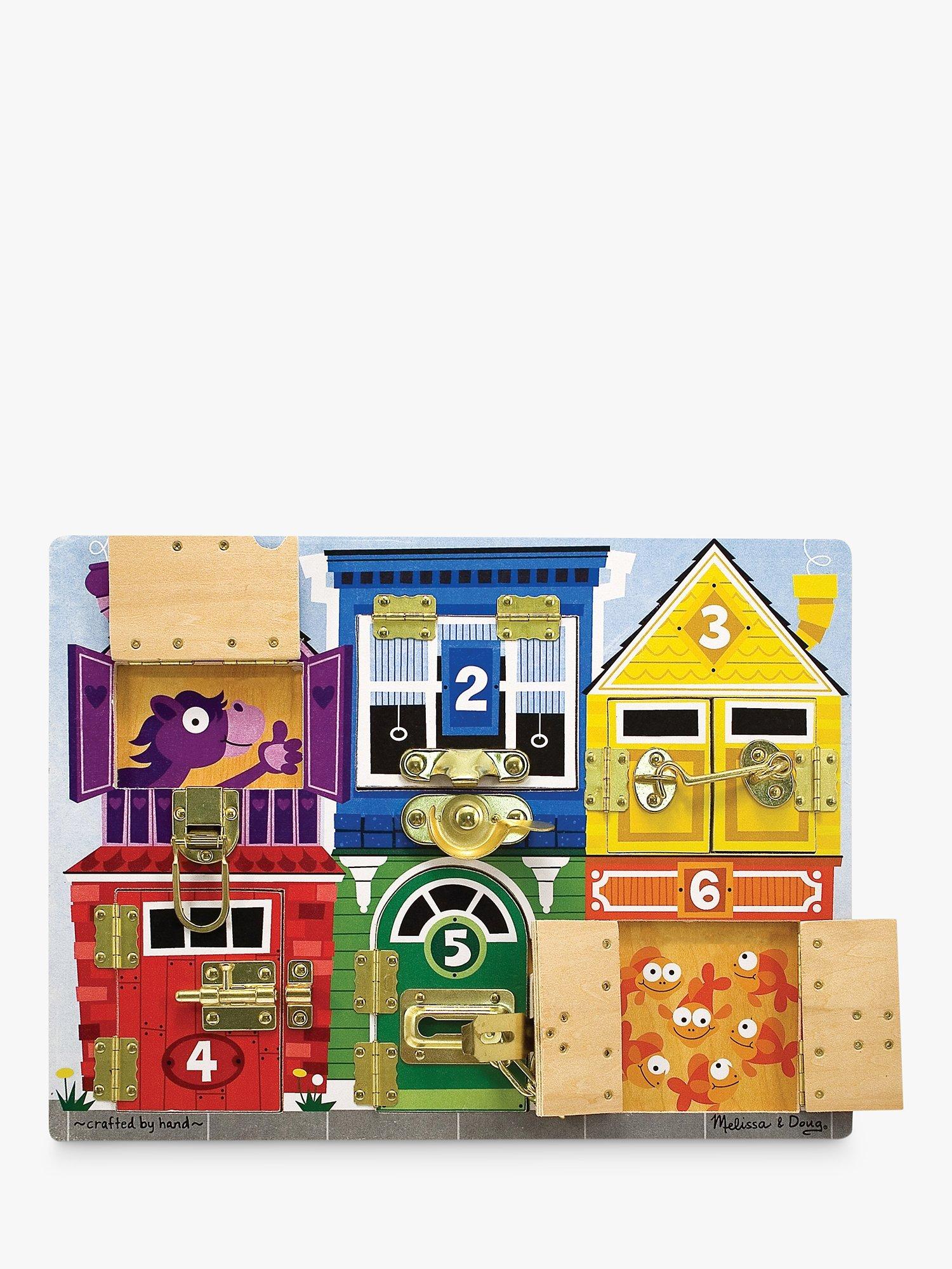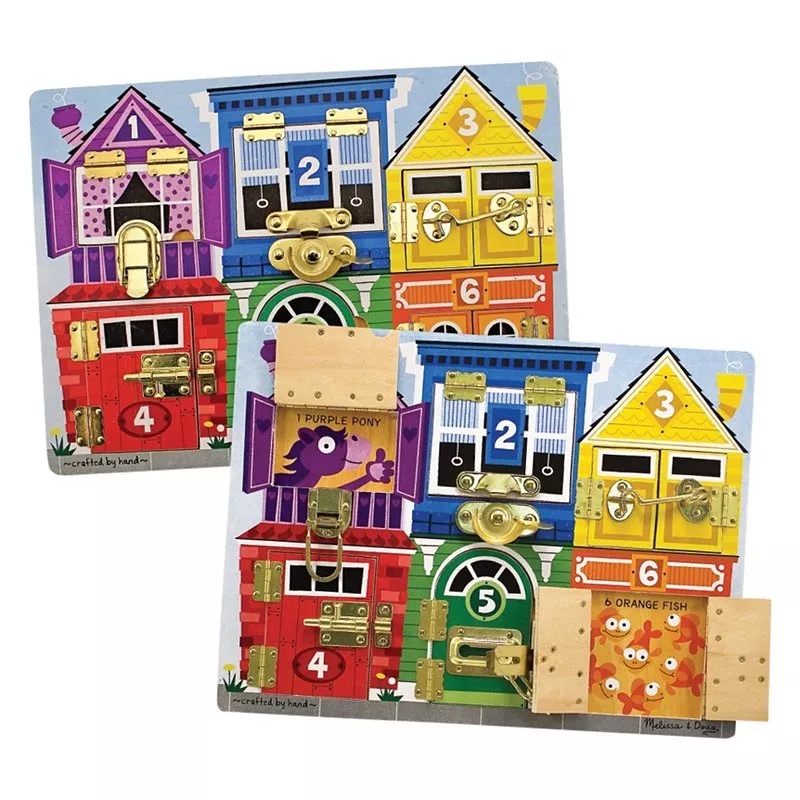 Undo a latch, swing open the numbered door, and count on fun when the picture beneath is revealed on this wooden play board. Help young ones learn colours, numbers, animals and more. There's lots to do!