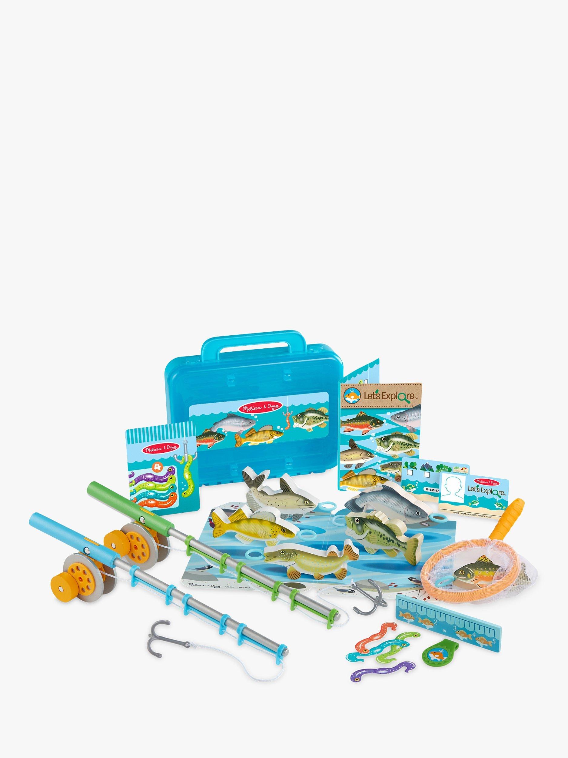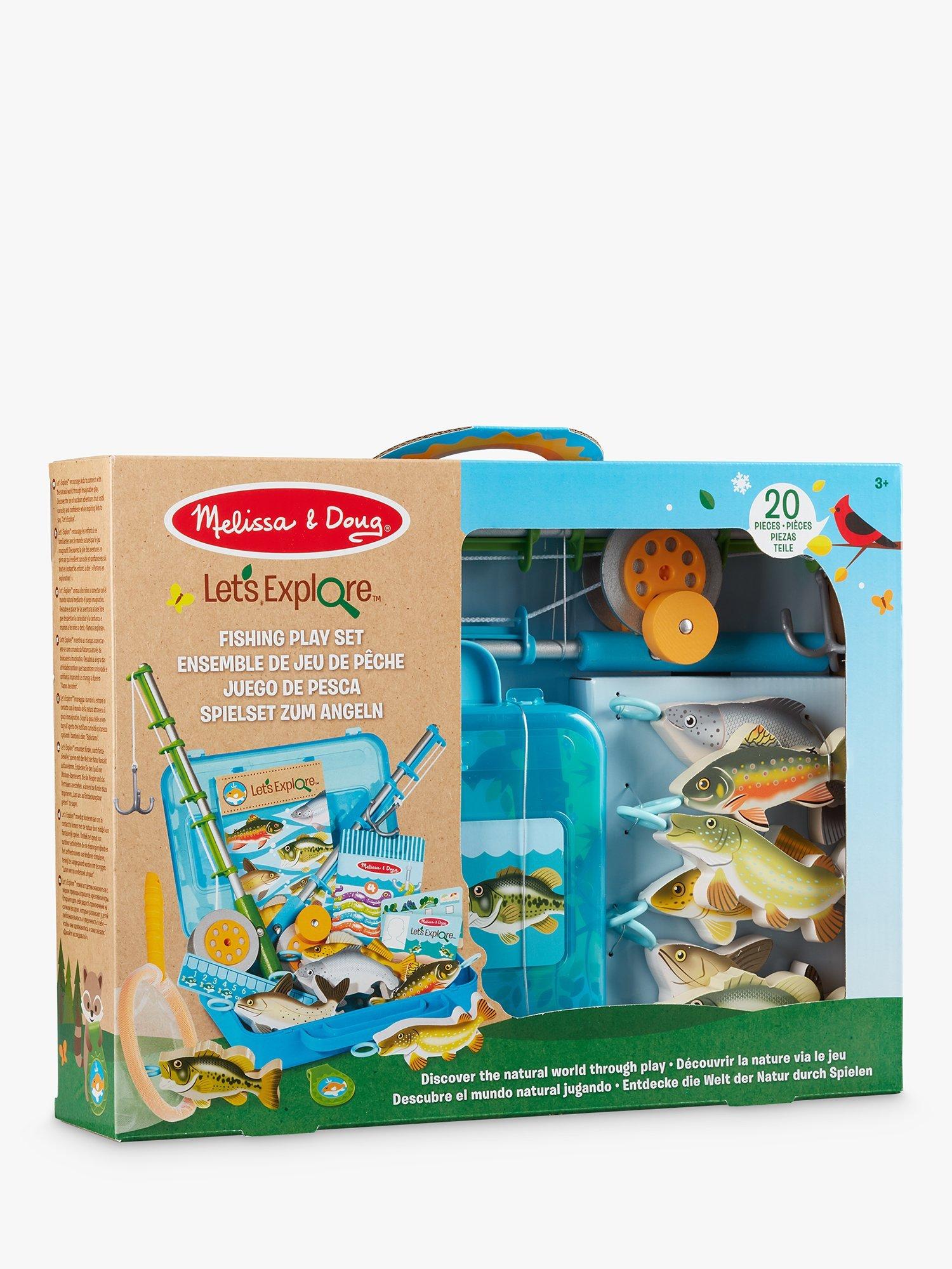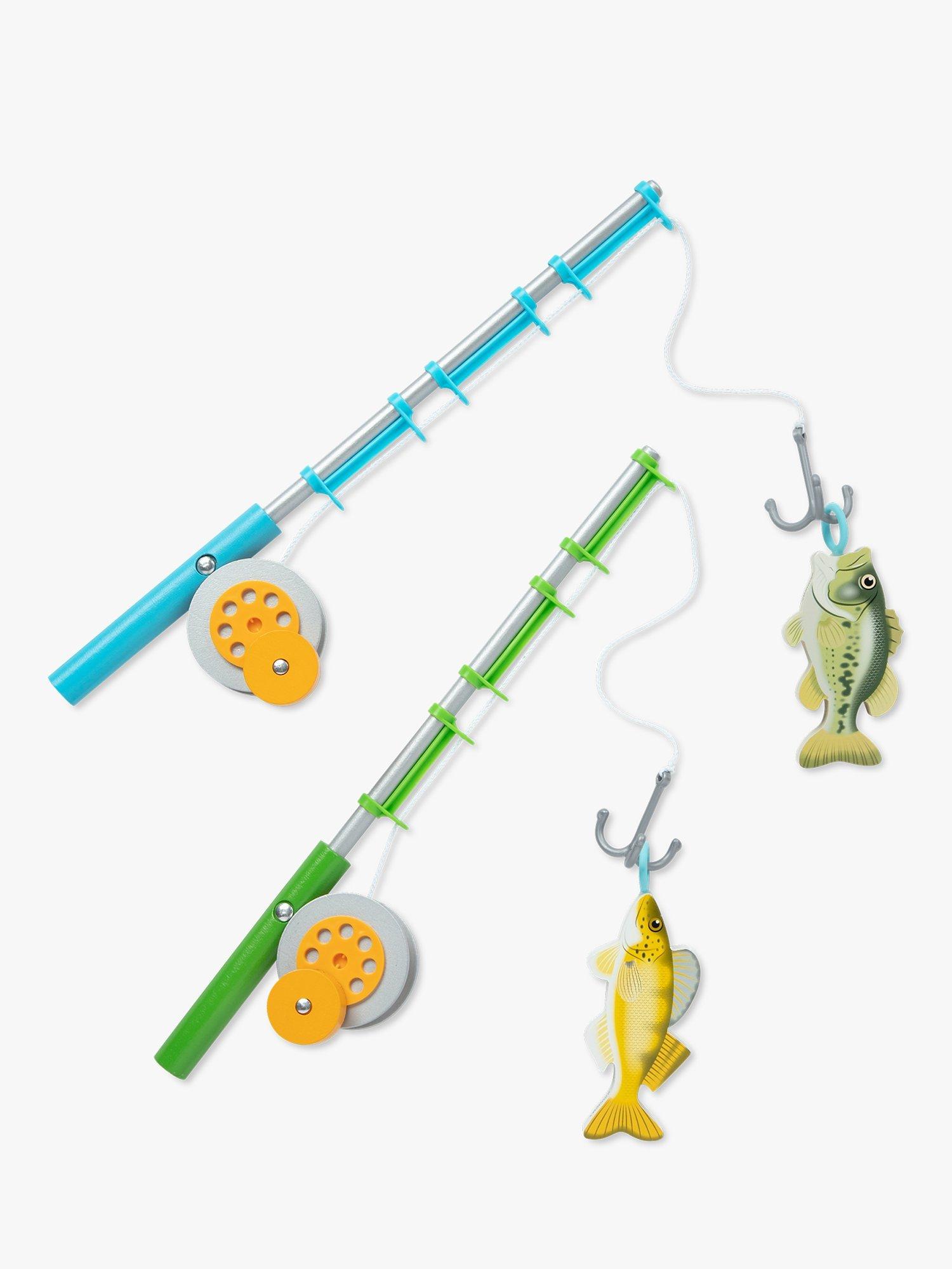 Explore the outdoor experience of fishing with this 21-piece Melissa & Doug playset! Grab the two wooden fishing rods, bait the hooks with pretend worms, then hook and scoop up the six wooden fish!