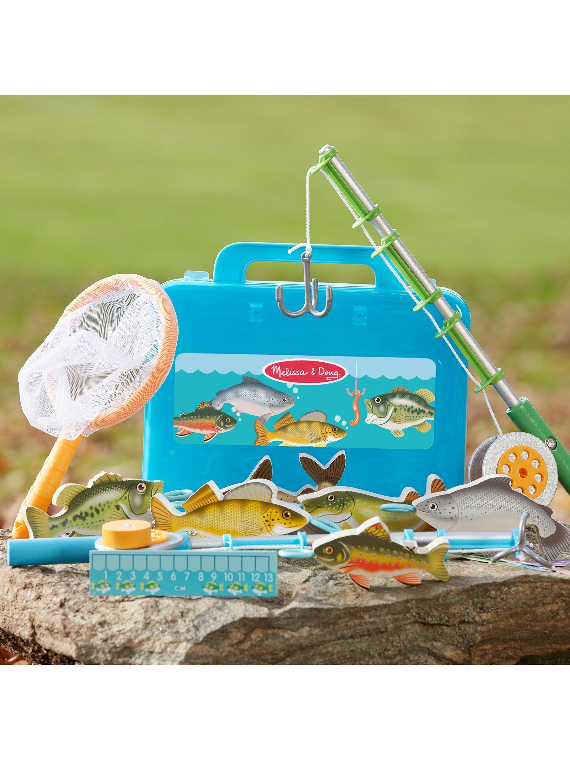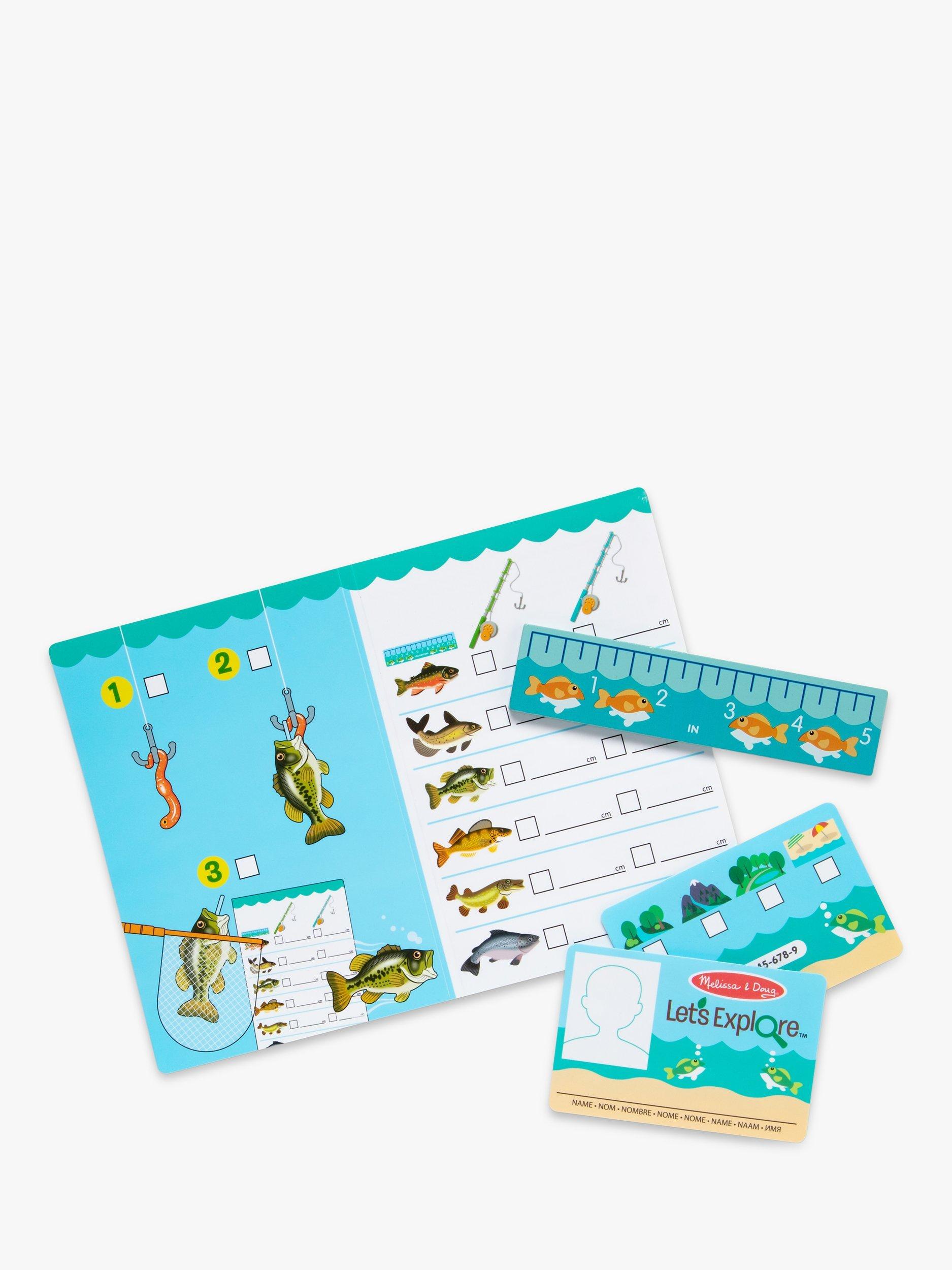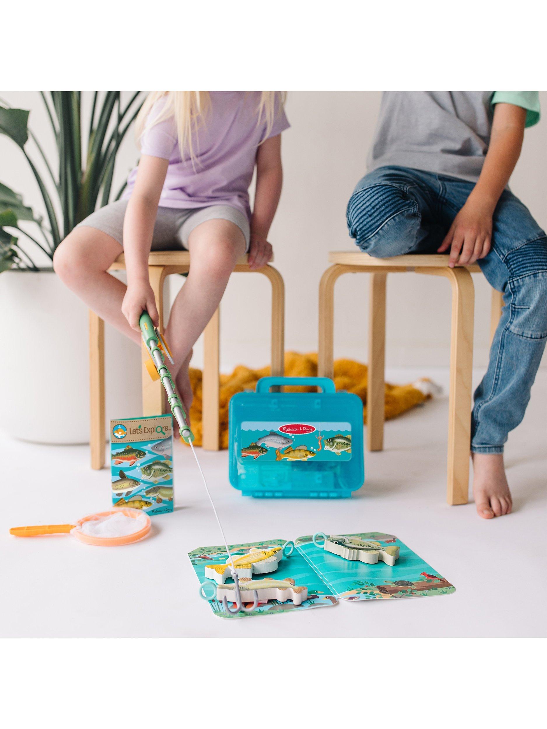 Explore the outdoor experience of fishing with this 21-piece Melissa & Doug playset! Grab the two wooden fishing rods, bait the hooks with pretend worms, then hook and scoop up the six wooden fish!