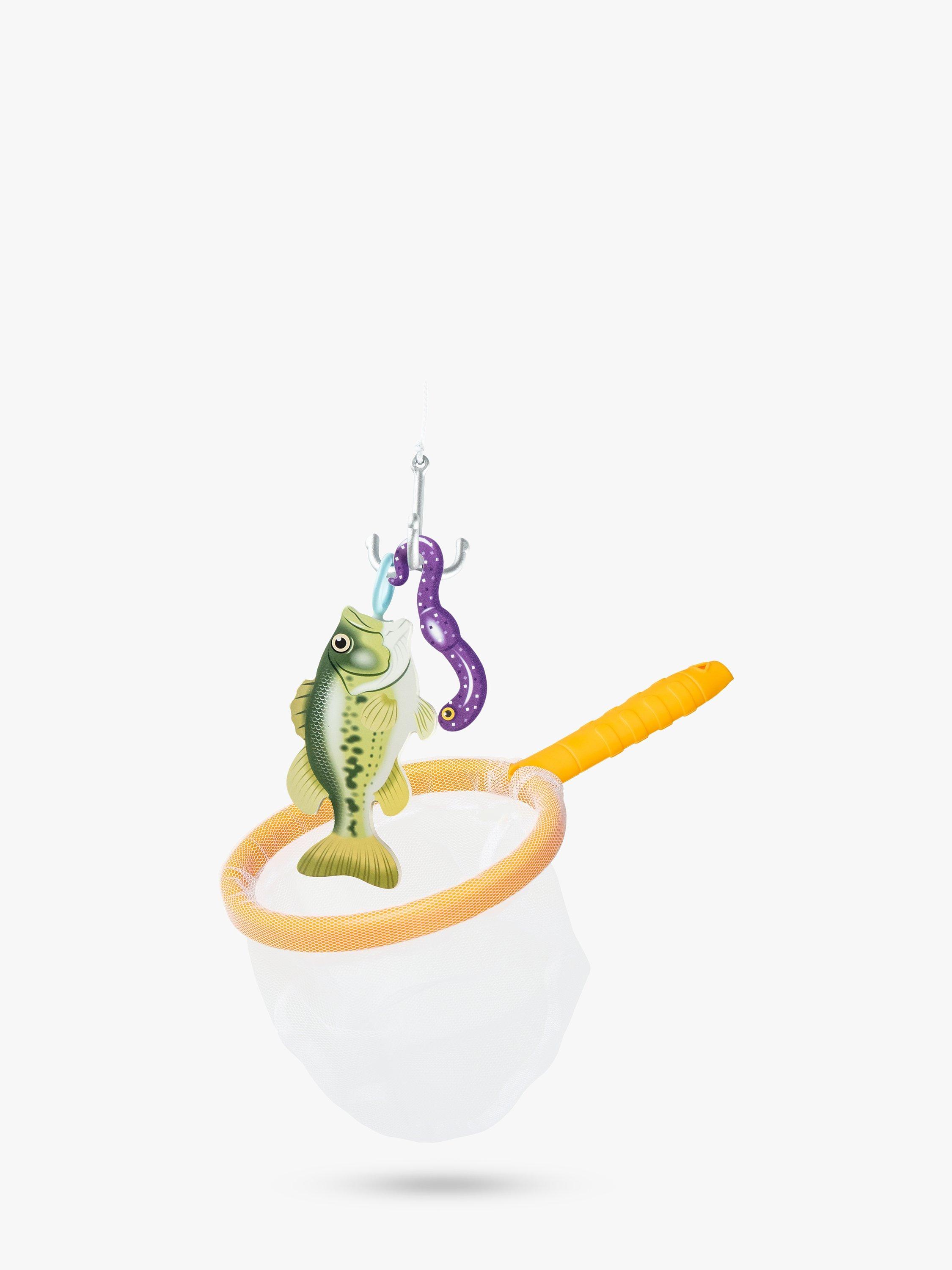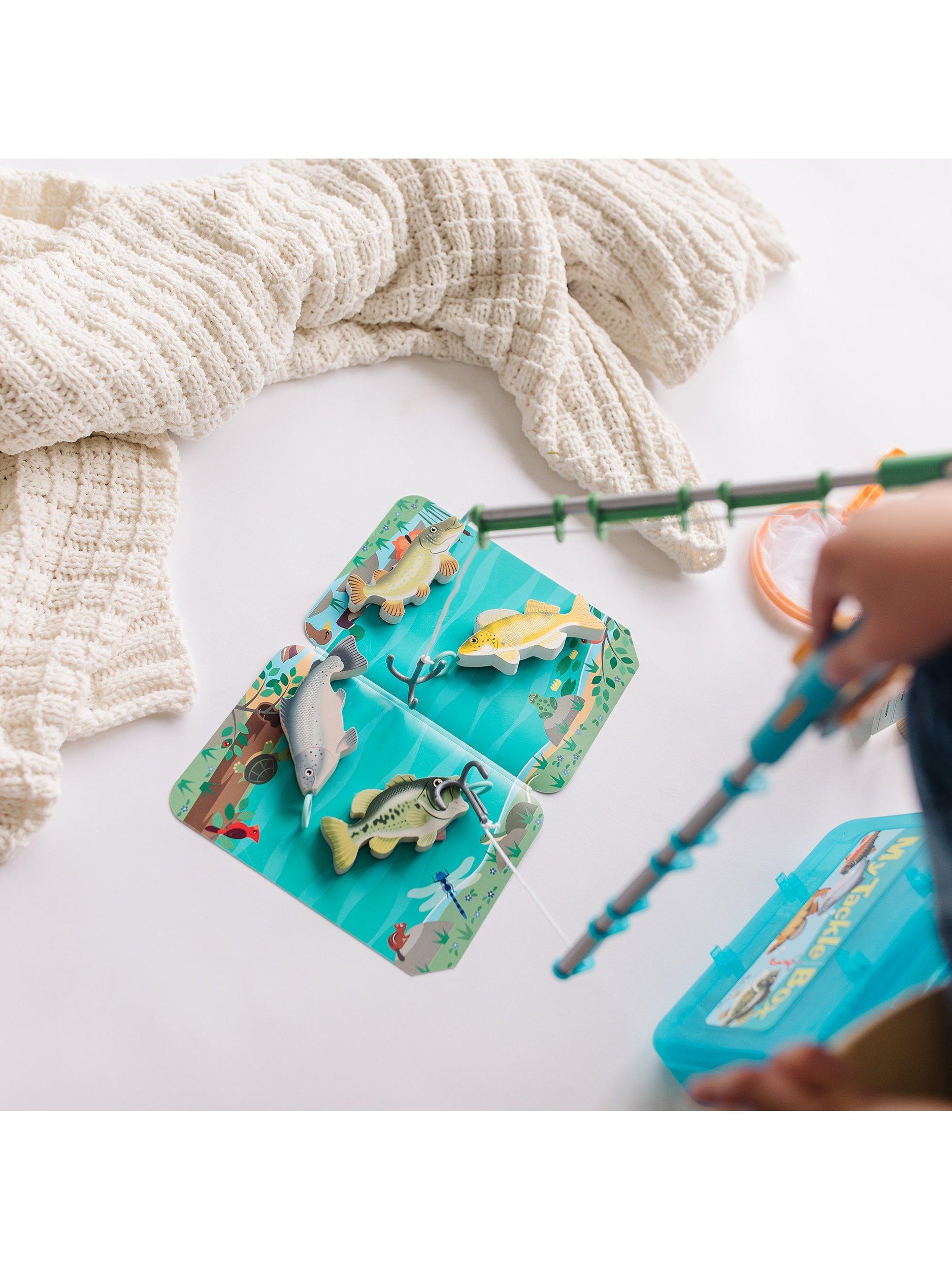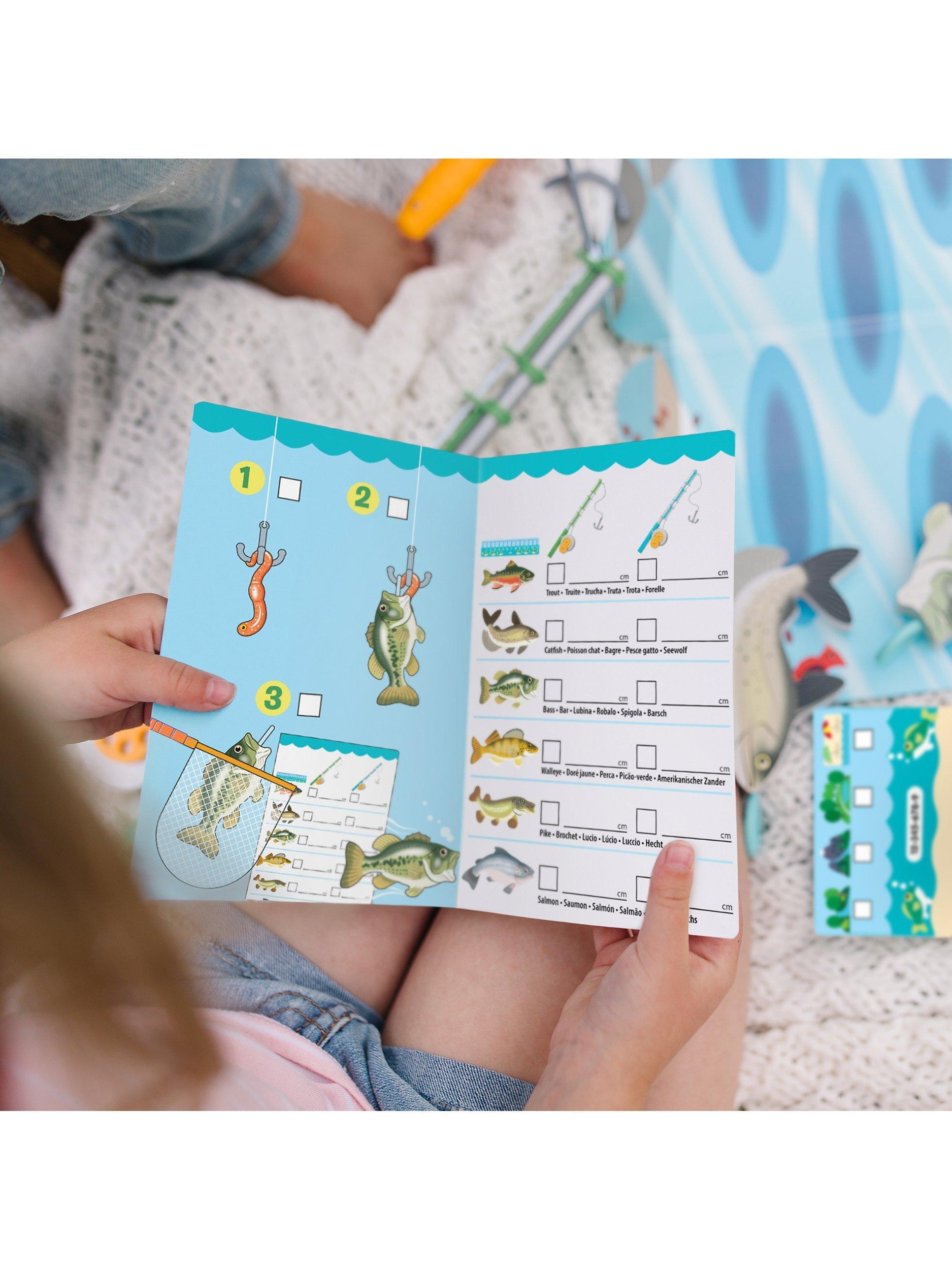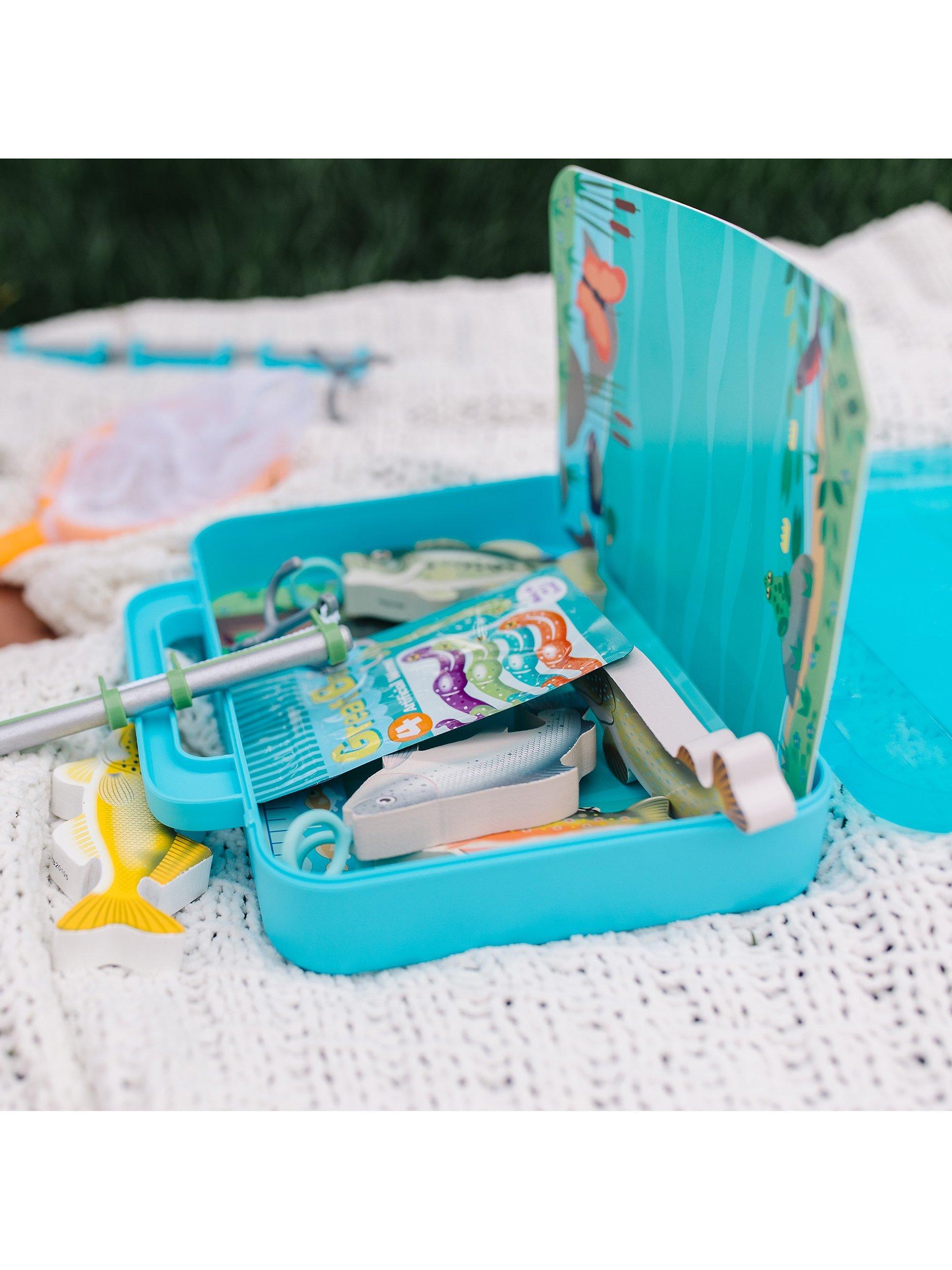 A reversible play mat lets young anglers choose a winter or summer experience. The illustrated fishing guide helps identify fish types, explains fishing basics, and includes fun games. Everything stores in the tackle box for quick and easy cleanup.