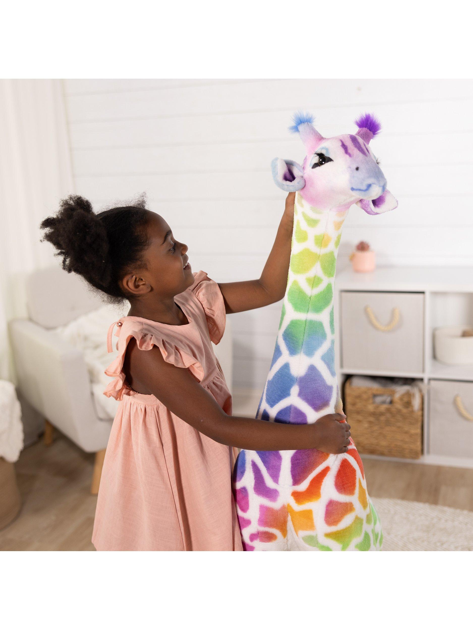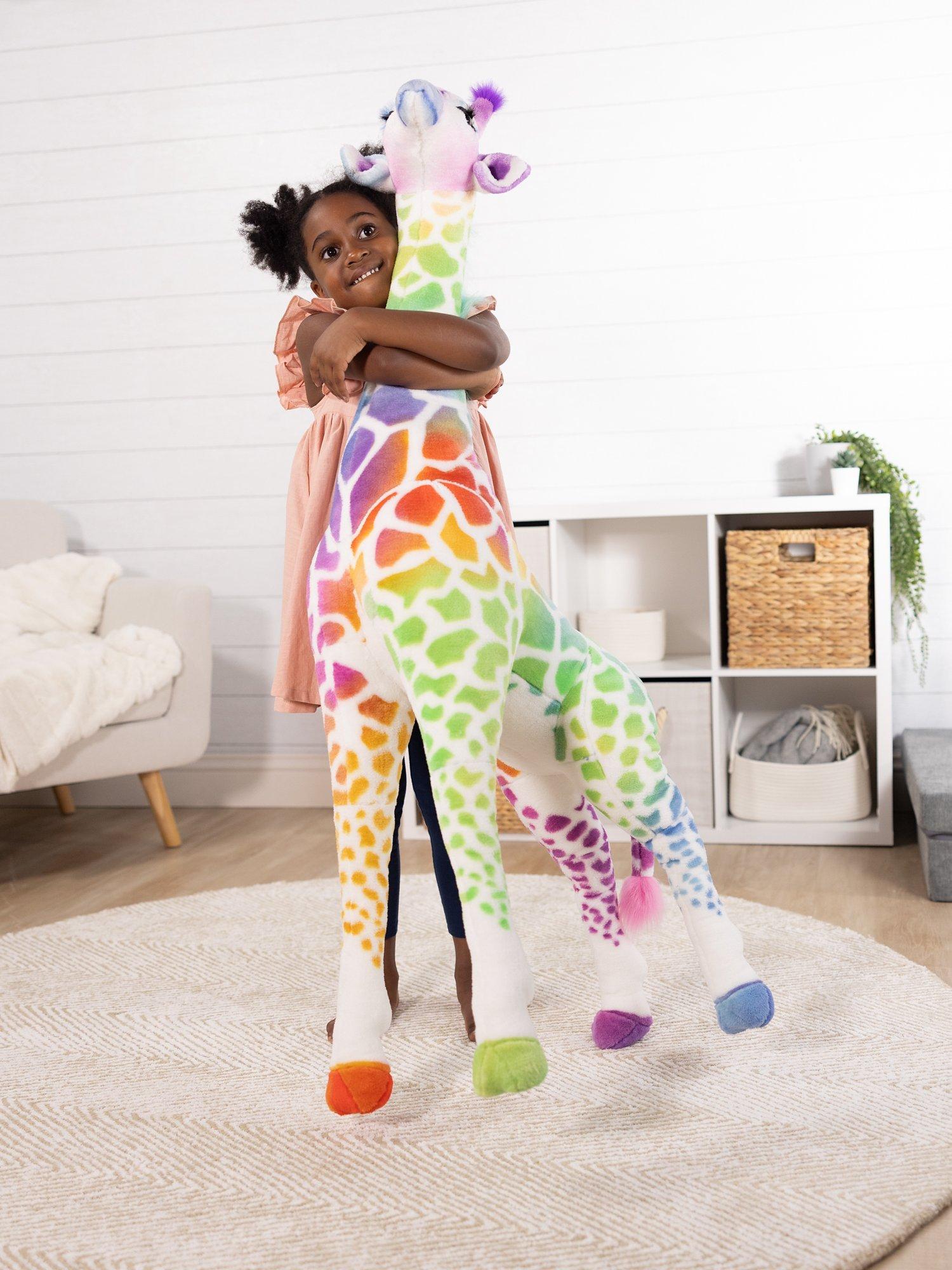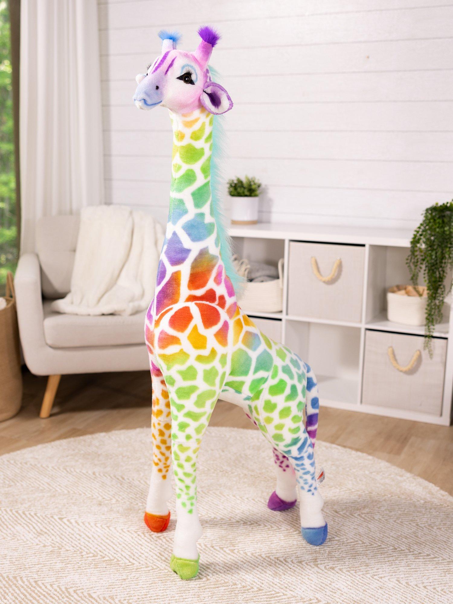 This four-foot-tall rainbow-patterned standing stuffed giraffe is a whimsical and delightful sight to behold, evoking wonder, joy, and excitement. Its vibrant fur features ombre red, orange, yellow, green, blue, and purple giraffe spots.