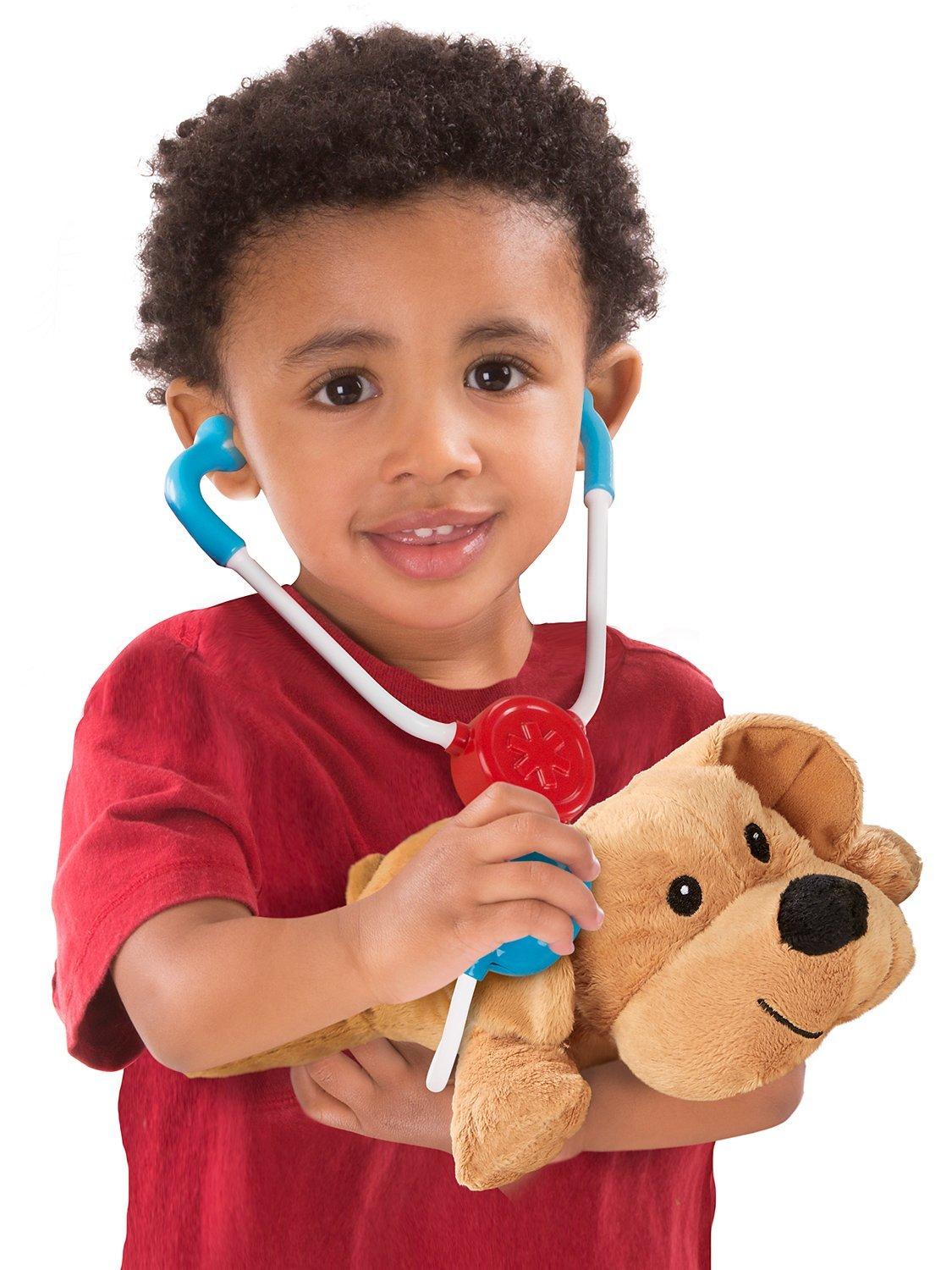 The 24-piece collection for aspiring veterinarians three and older comes with two adorable plush pets (a dog and a cat), and accessories galore, including a stethoscope, thermometer, syringe, ear scope, tweezers, and clamp. There are bottles, tubes, and tubs of pretend treatments and ointments, bandages and a cast for boo-boos, and even a neck 'cone' to keep pets from licking!