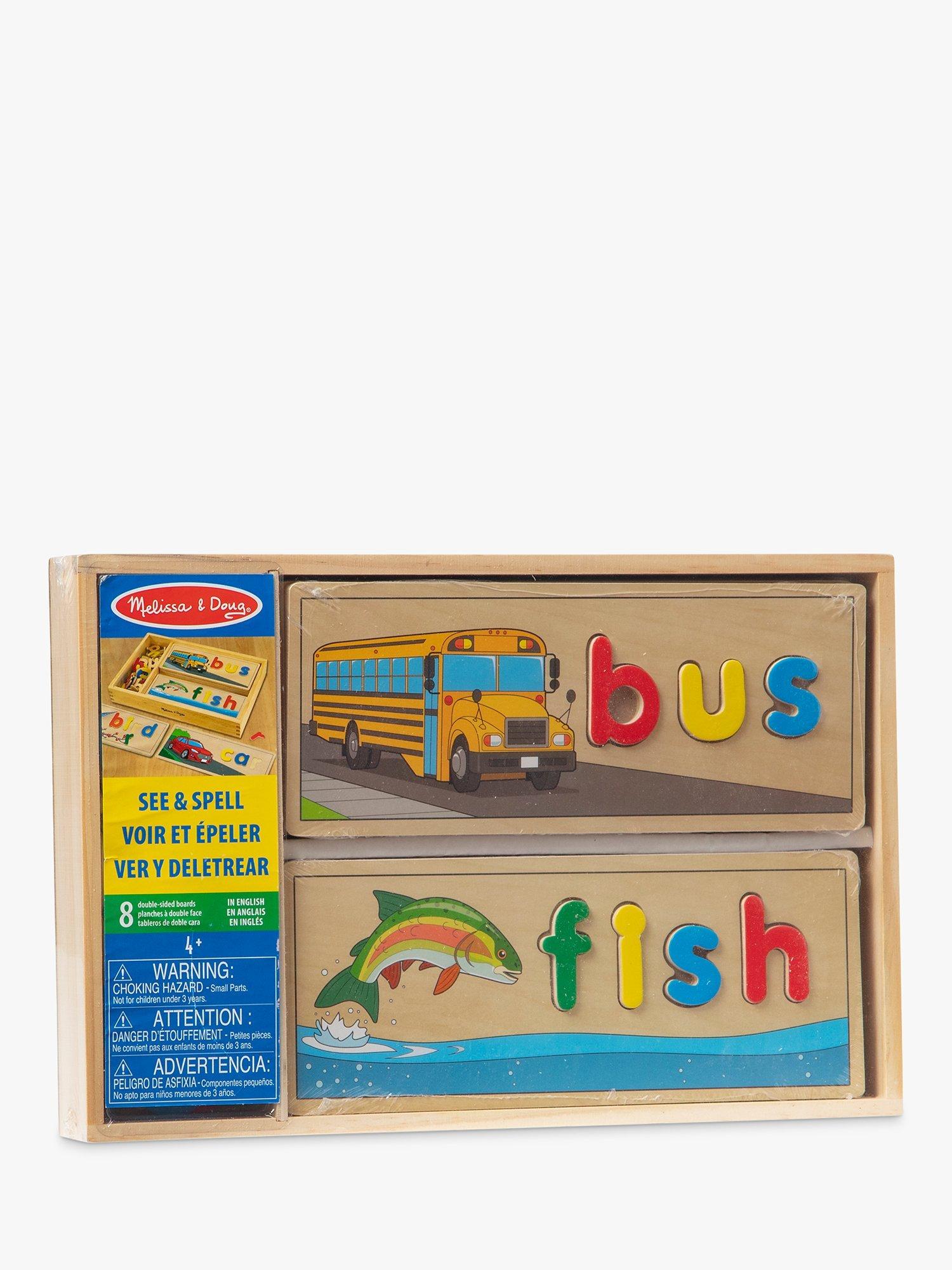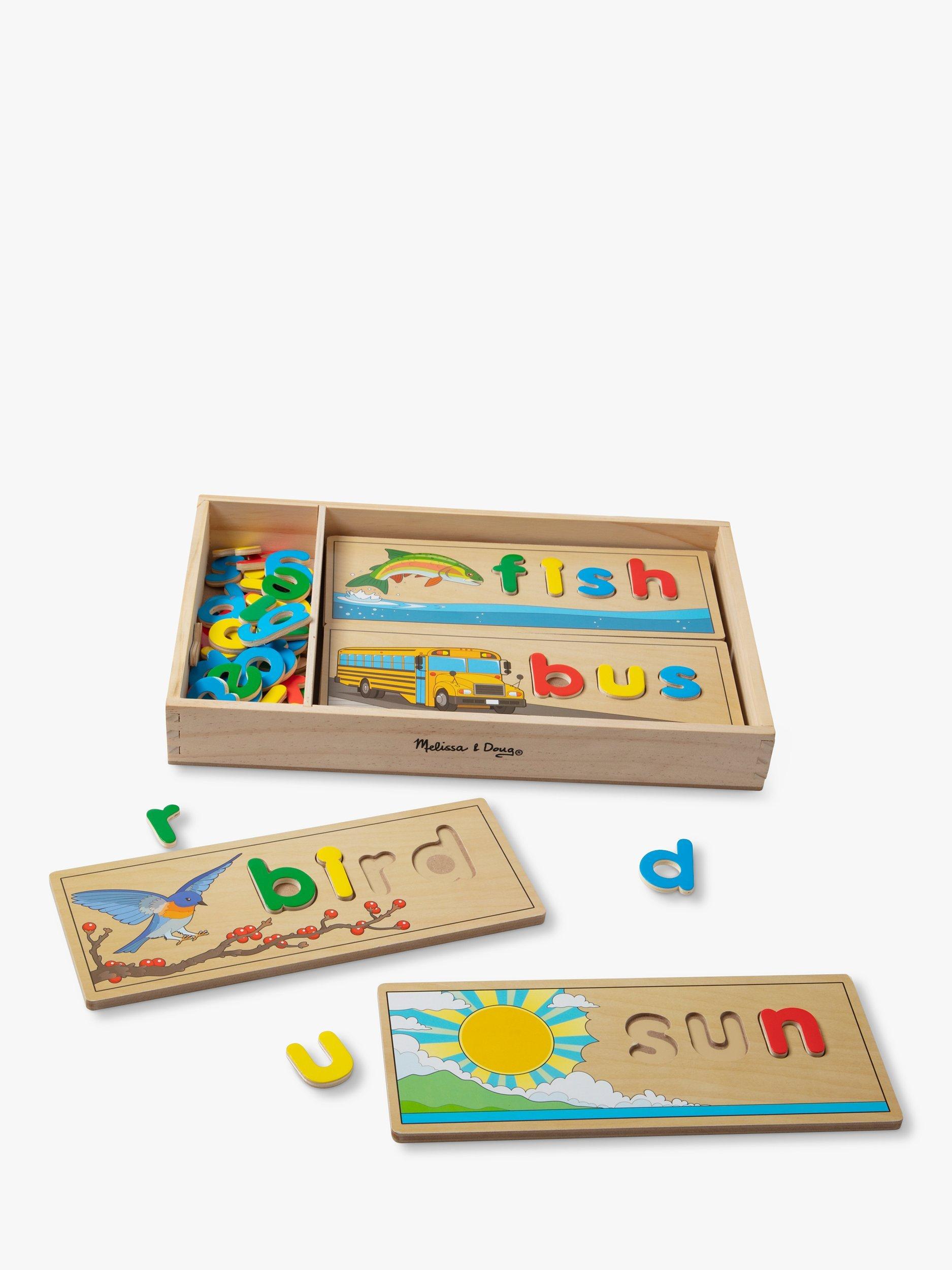 Complete a puzzle to spell a word! This handsome wooden puzzle set helps children gain familiarity with the letters of the alphabet and their sounds as kids develop a sight-reading vocabulary. The letters are also wonderful for stencilling and lots of learning games. More than 50 colourful wooden letters fit into the eight two-sided cutout boards to spell three- and four-letter words. All this spelling and fine motor fun fits into one compact wooden storage case!
