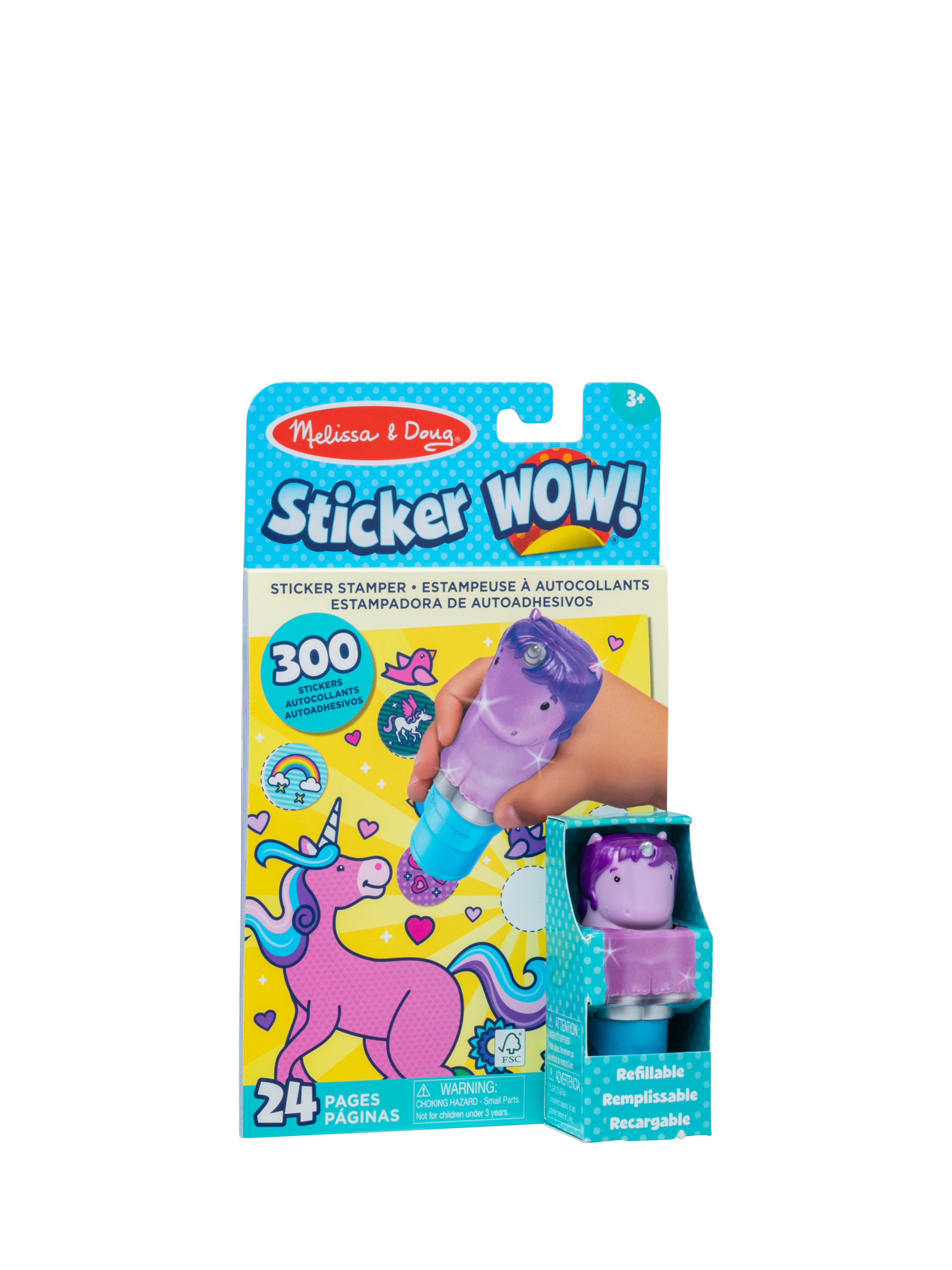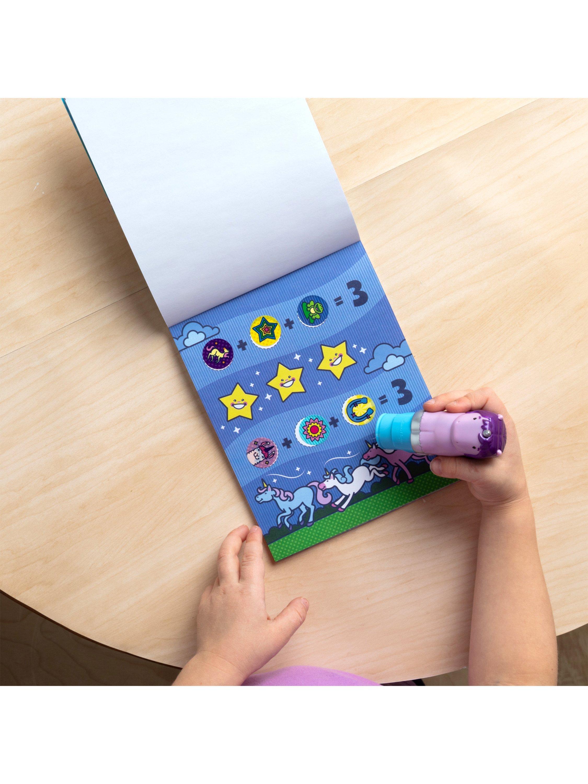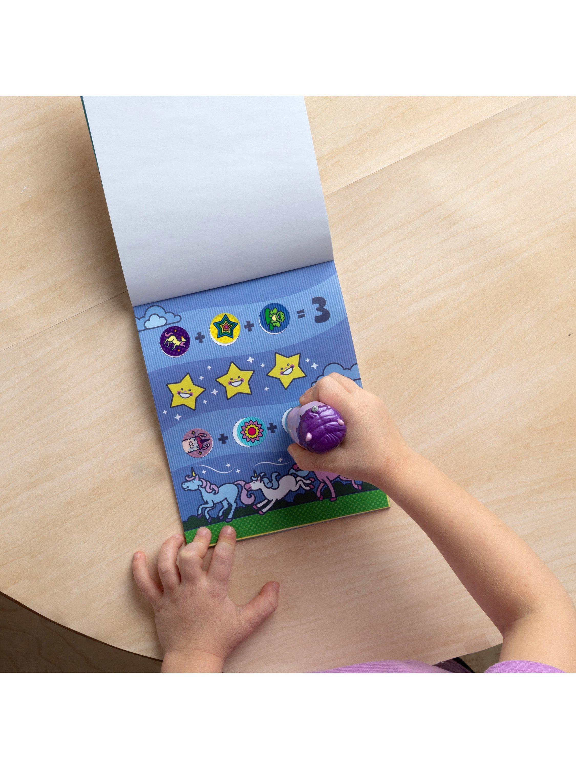 Melissa & Doug Sticker WOW!™ is a whole new way to play with stickers! Let the adorable, collectable Cupcake the Unicorn stamp, stamp, stamp its way through 24 pages of fun-filled, fantasy-themed counting, matching, and search-and-find activities. The refillable sticker stampers come pre-loaded with sticker stacks of 300 assorted stickers – with 100 unique designs in every stack, each sticker is a surprise! Stickers are not reusable, but are easy to remove if necessary. Fill in the activity pages and use for creative art projects, such as bookmarks, posters, cards, and more. Easy-to-remove stickers and the convenient on-the-go format with built-in sticker stamper storage makes Sticker WOW!™ a great mess-free travel activity. Sticker WOW!™ (patent pending) promotes fine motor skills, encourages creative play, and it’s satisfying, fidget fun!