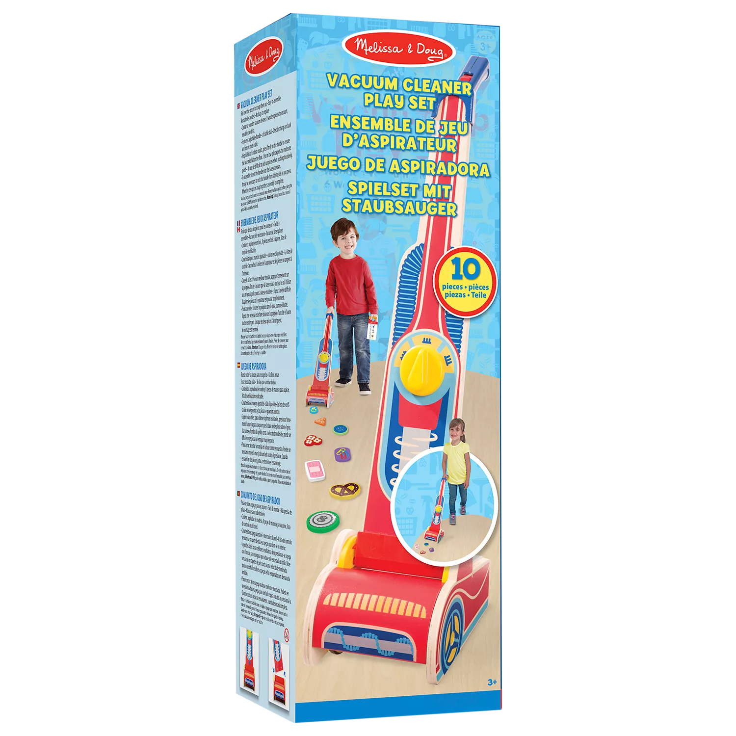 Clear a path to fun with this kid-sized wooden Vacuum Cleaner Play Set from Melissa and Doug! Roll over the eight wooden pieces (cereal, popcorn, pretzel, button, ring, bandage, paper clips, coin) and watch them disappear into the base. Lift the lid to empty it out and scatter to scoop them up again!