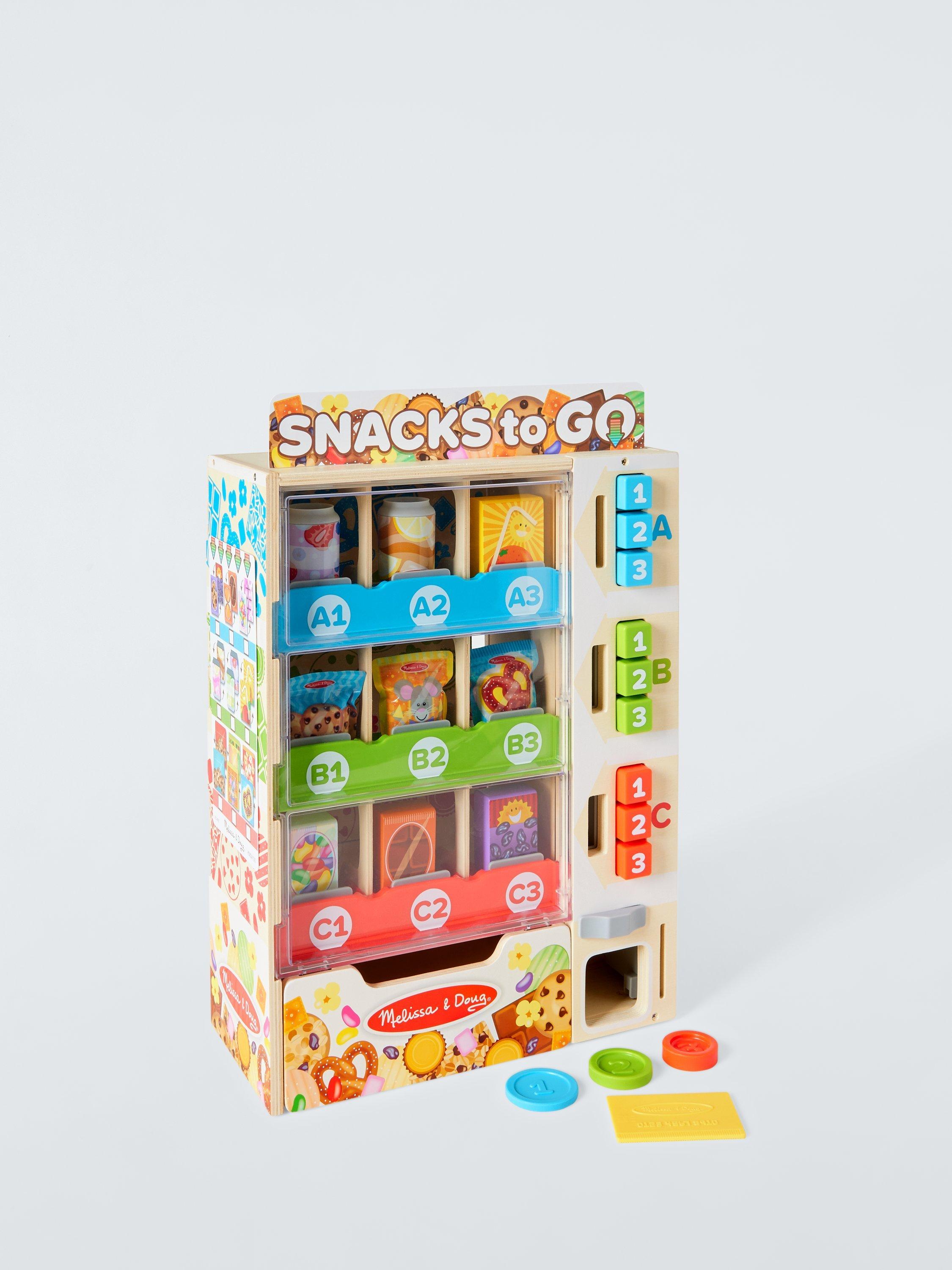 Satisfy hungry imaginations with the push of a button! Open up the back of the unique wooden vending machine from Melissa & Doug and stock it with nine double-sided play food packages, including snack bars, drinks and pouches.