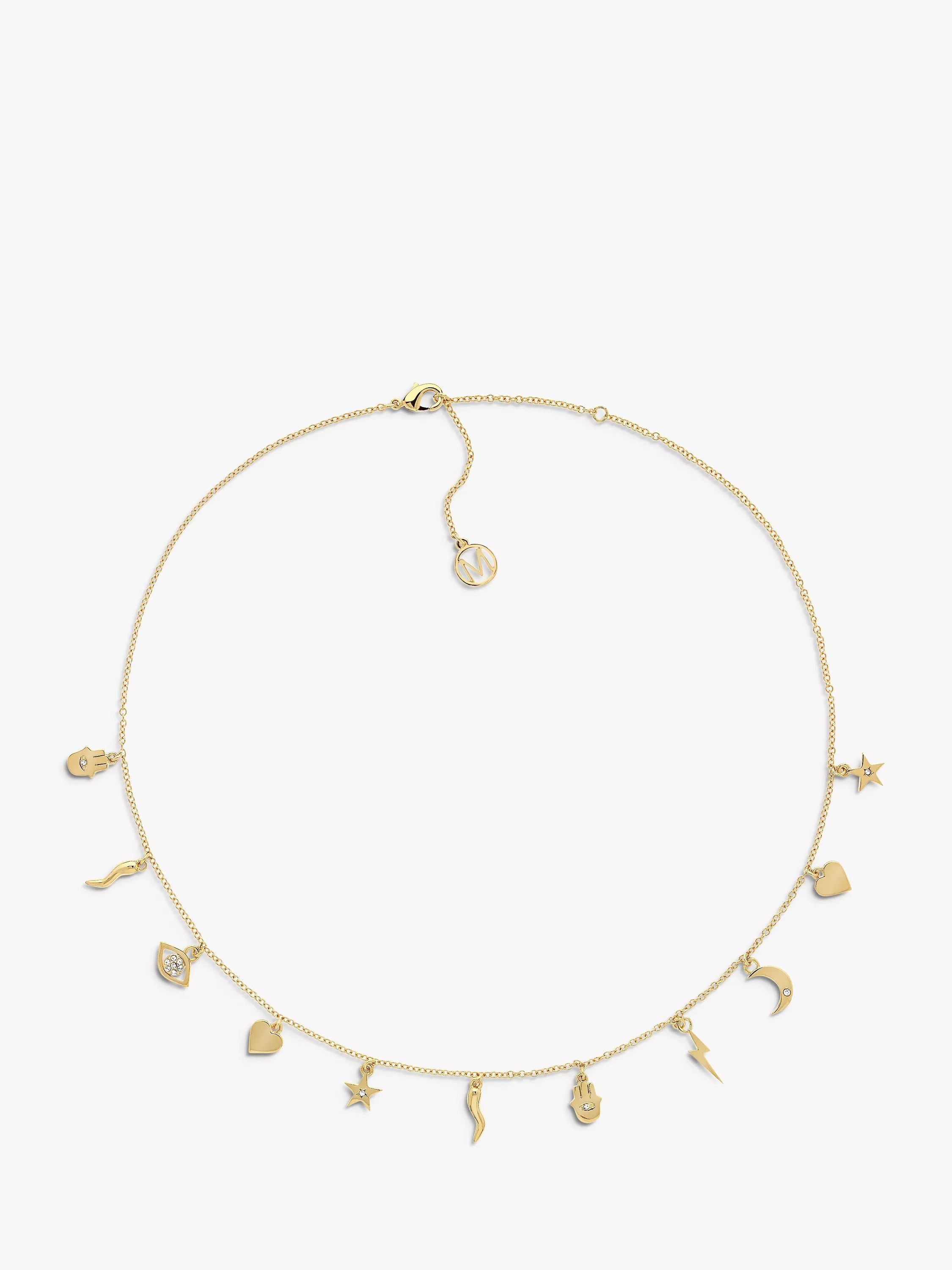 This Melissa Odabash necklace presents a mix of beautiful charms, each set with a sparkling glass crystal. The charms are arranged on an adjustable chain. The necklace can be easily worn on its own or layered with longer plain chains for a bolder look.