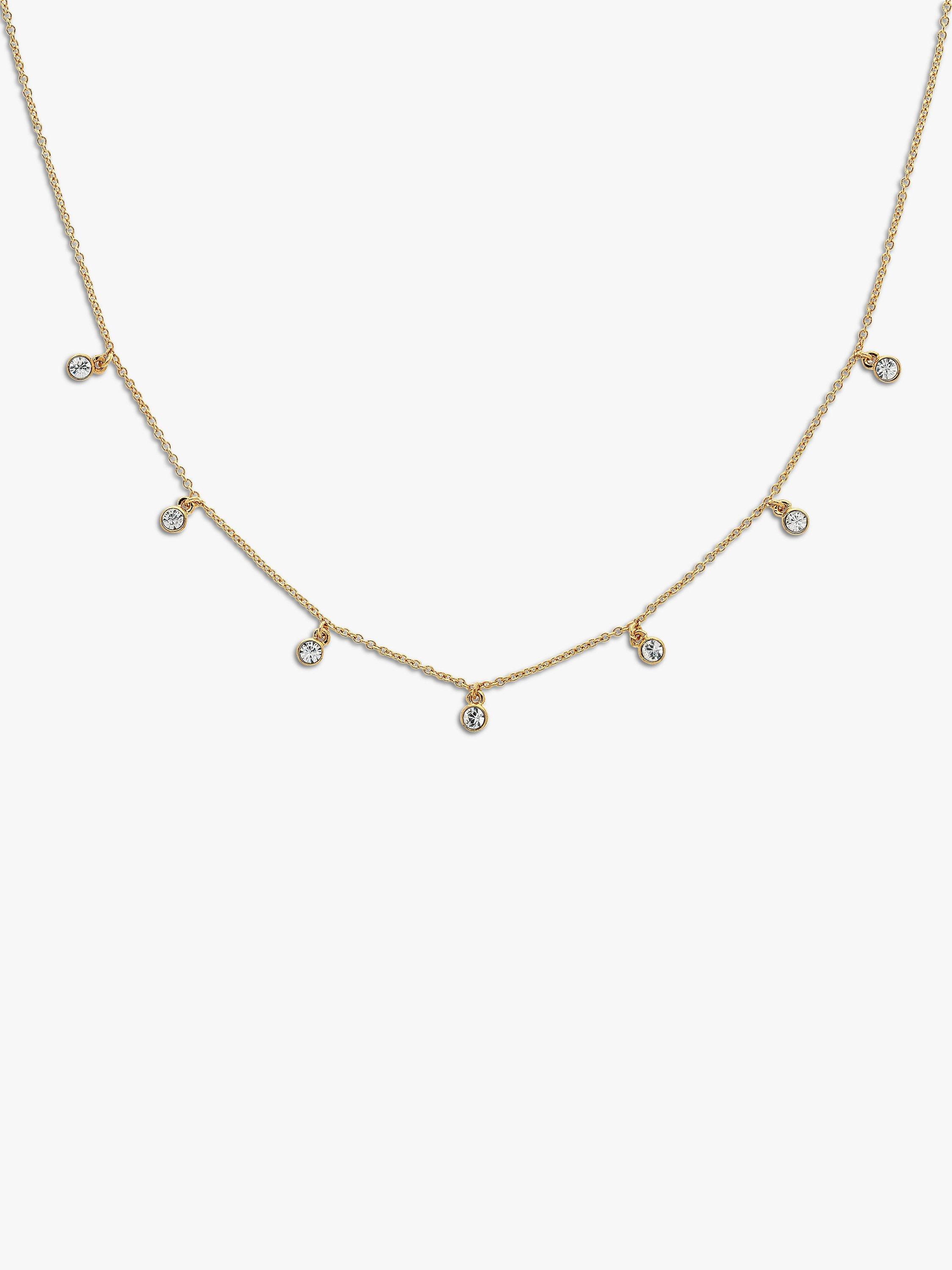 The chain is slender and fine and suspends faceted glass crystals in a rub-over setting that implies a teardrop shape. The piece will look great both on a roll-neck jumper and an open-neck blouse.