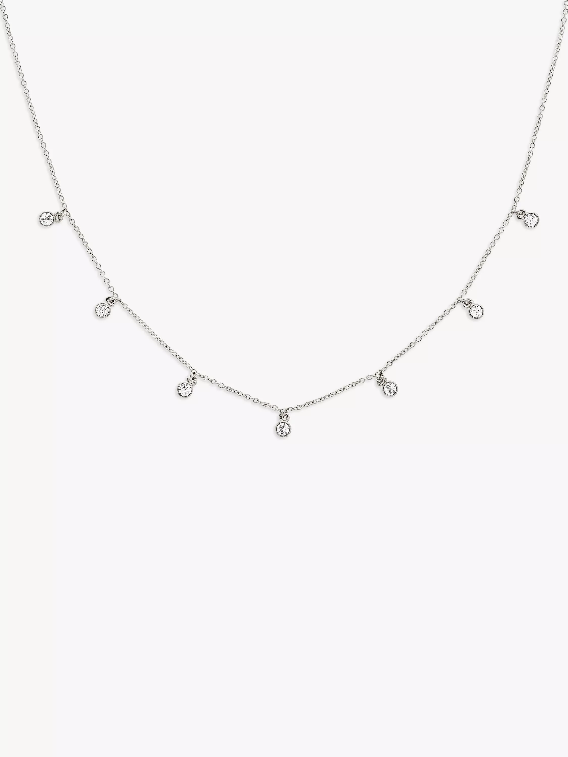 The chain is slender and fine and suspends faceted glass crystals in a rub-over setting that implies a teardrop shape. The piece will look great both on a roll-neck jumper and an open-neck blouse.
