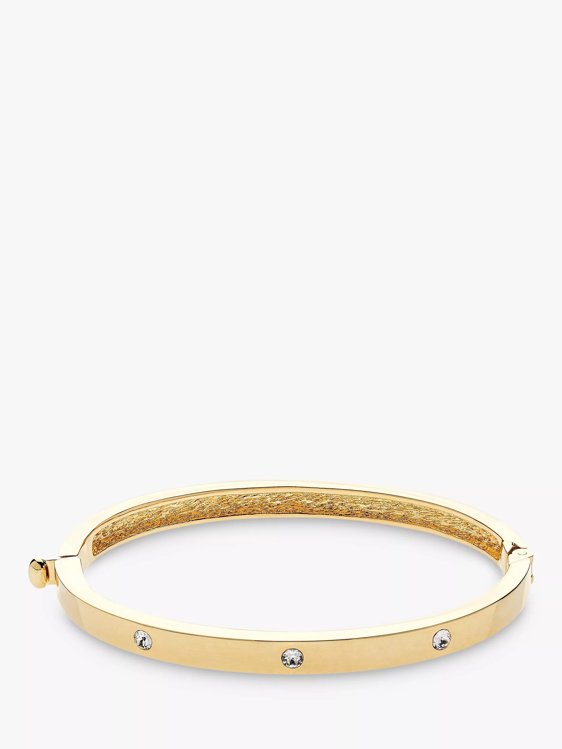 Designed with a hinged clasp, the piece is adorned with faceted crystals that bring light and glamour to the wrist. The bangle is sleek enough to be stacked with other bangles for a statement finish.