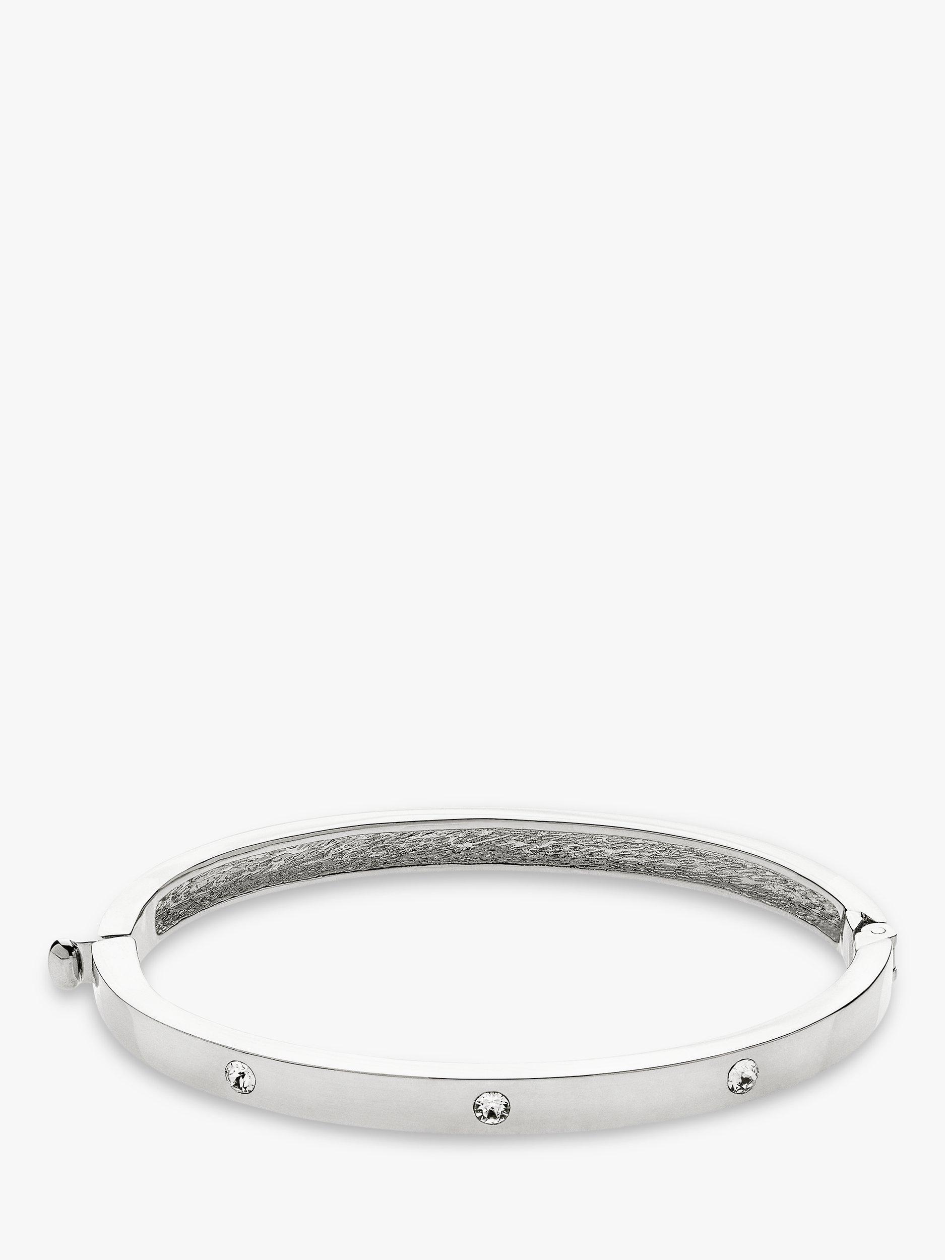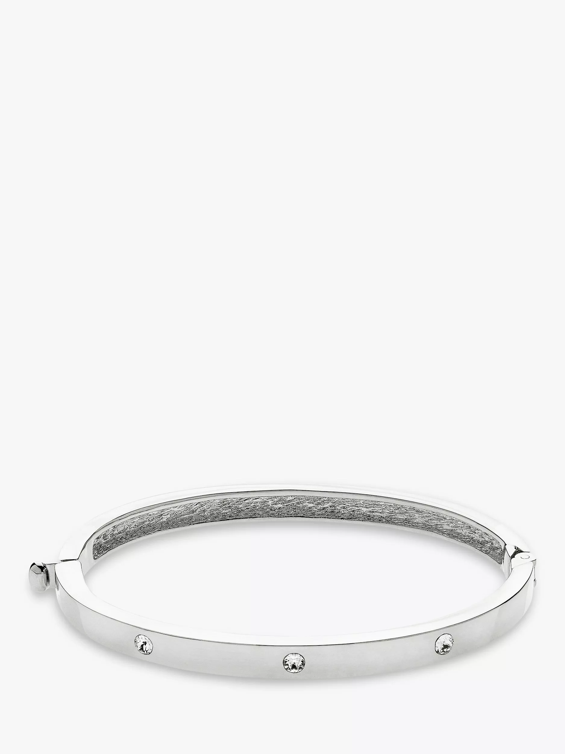 Designed with a hinged clasp, the piece is adorned with faceted crystals that bring light and glamour to the wrist. The bangle is sleek enough to be stacked with other bangles for a statement finish.