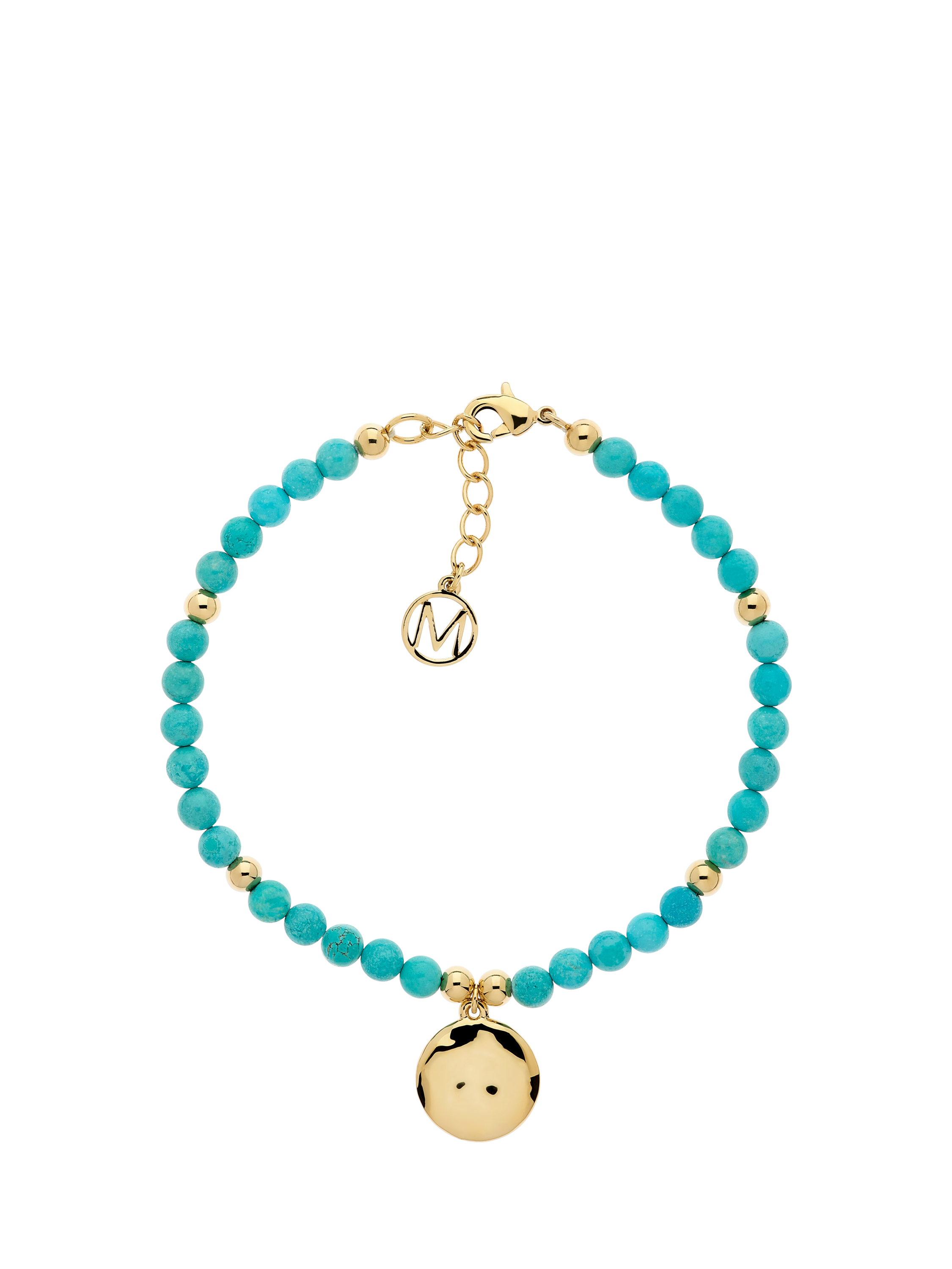 This beaded bracelet features pretty turquoise beads with a gold disc charm. Secured with a lobster clasp and adjustable extension chain for the perfect fit.