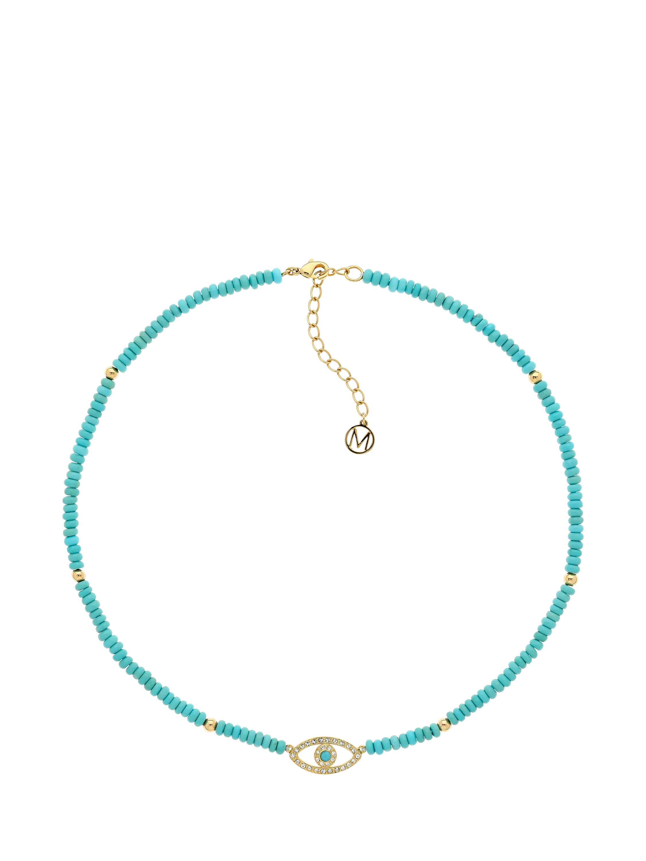 Elevate your look with this crystal set evil eye necklace featuring turquoise beads. Secured with a lobster clasp and can be adjusted in length for the perfect fit.