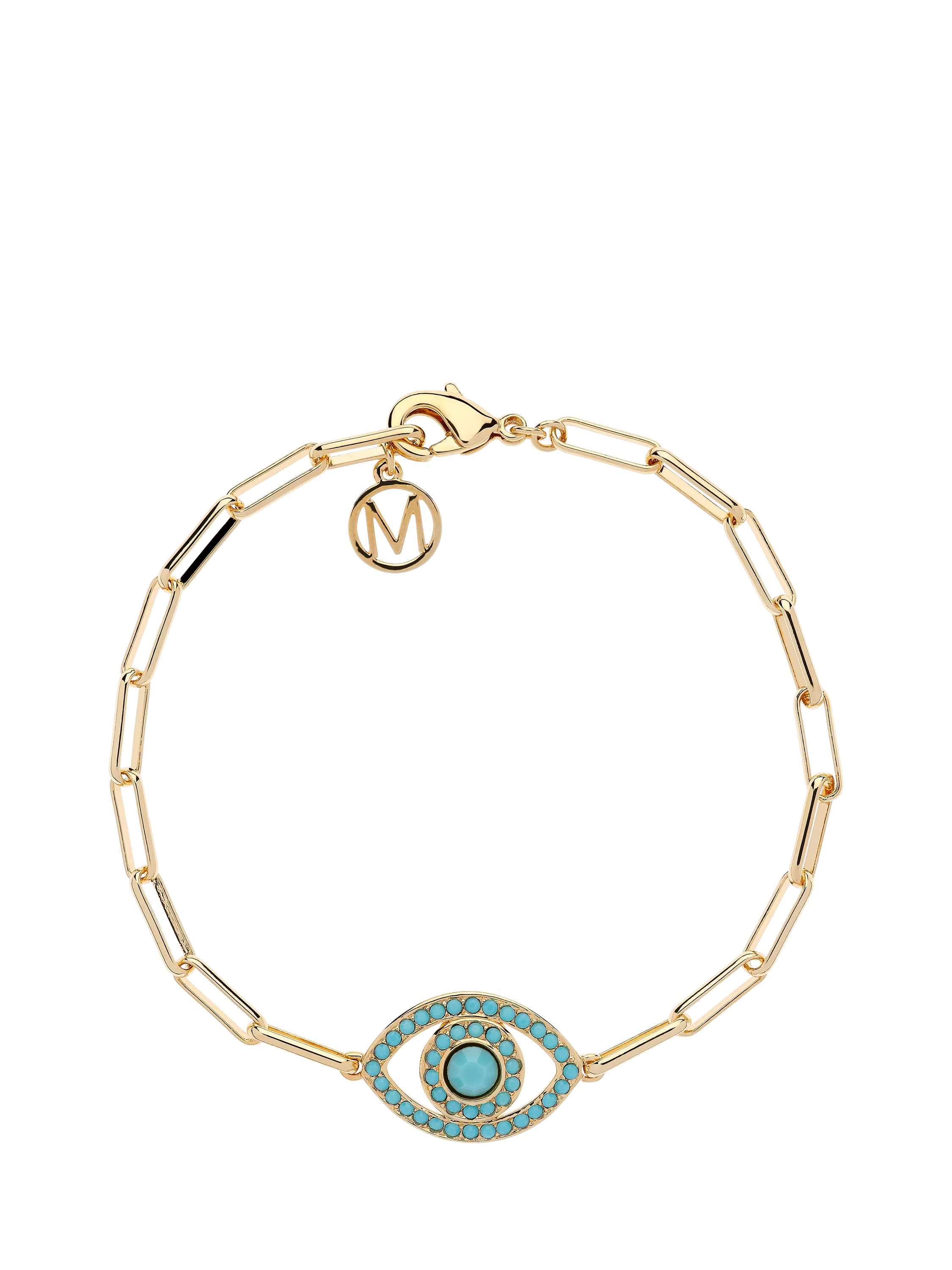 Bright turquoise sparkling crystals, set in a Melissa Odabash signature eye design and finished with a paperclip gold plated chain.