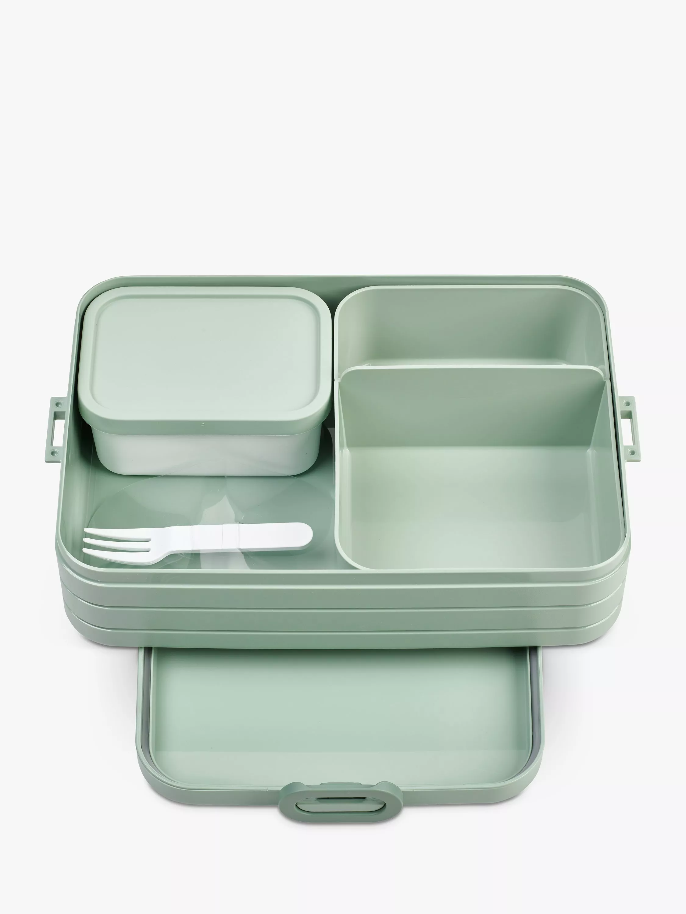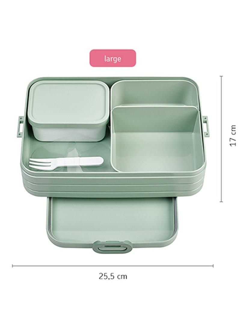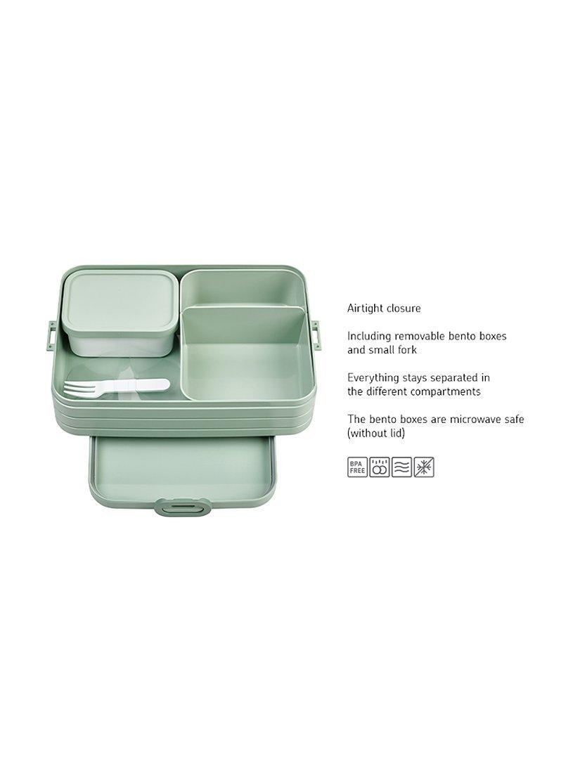 This large Bento lunch box includes a removable Bento box to keep meals separate. Put sandwiches in one section, separate from fresh fruit, meat or cheese in the other. Or remove the Bento box to store larger sandwiches. There's also an extra lidded box plus a little fork for lunch on-the-go.