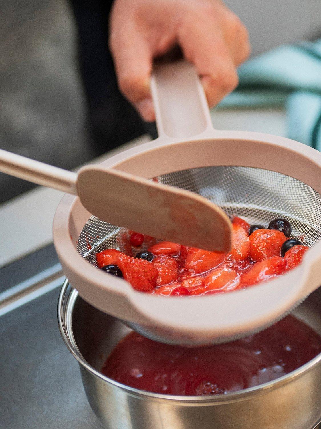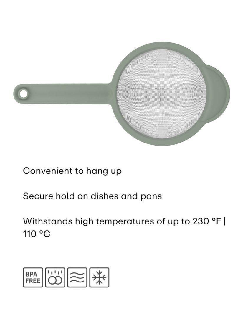 The Mepal Chef It sieve is great for fine sieving flour or passing soups and sauces. Thanks to the fine grid with a 16.5cm diameter, unwanted lumps and coarse pieces are effortlessly removed. You can easily hang the sieve by the loop on the handle. It withstands high temperatures of up to 110°C and has a secure hold on dishes and pans. Made from BPA-free materials, it's dishwasher safe for easy cleaning.