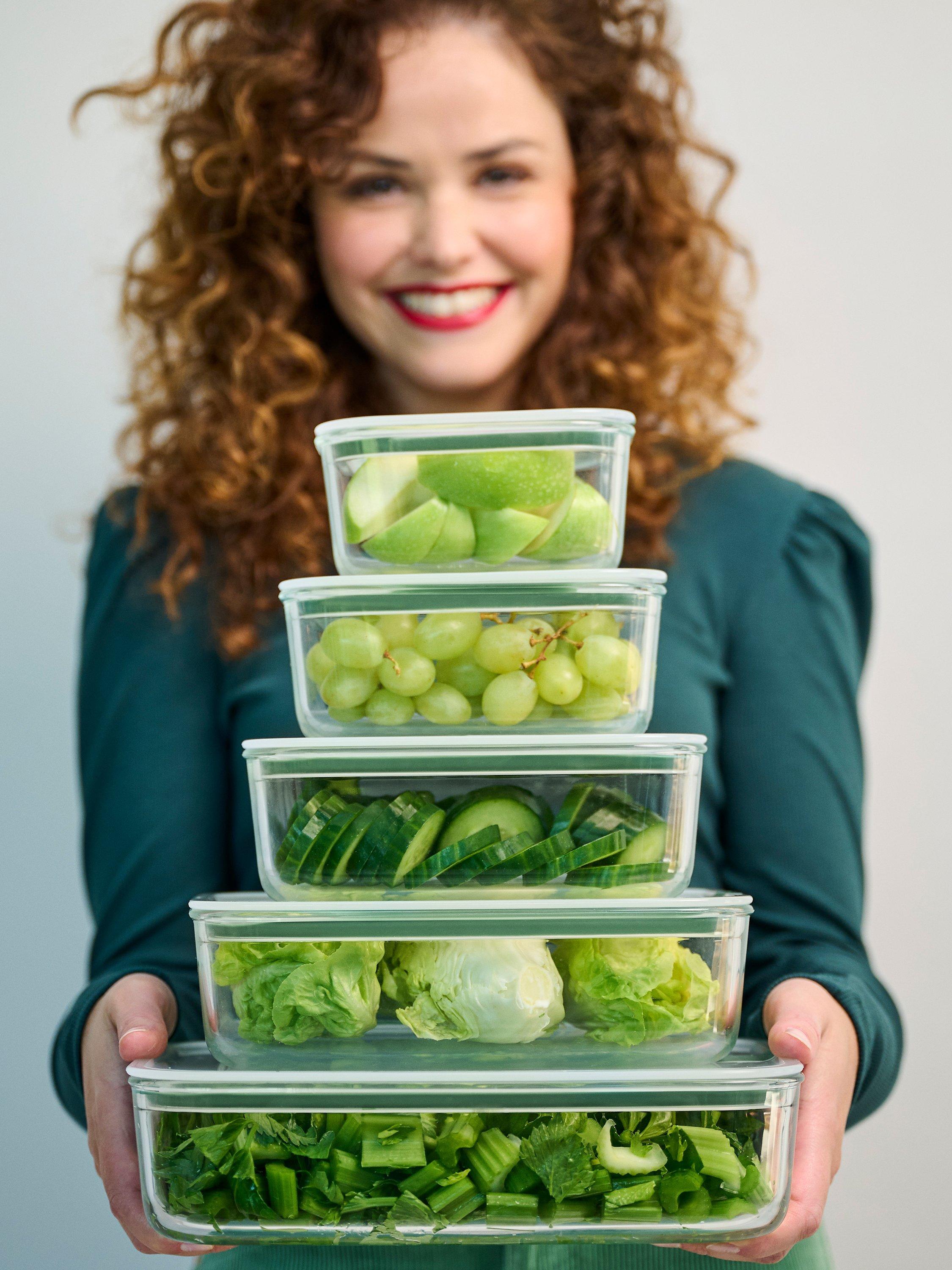 Store a leftover piece of quiche or cake in this glass dish. With one click, the glass dish is leak-proof and aroma-tight. Click, seal and store. Thanks to the design of this storage champion, you will have super sleek organisation in your fridge or freezer. And because of the transparent lid and dish, you can see the contents at a glance.