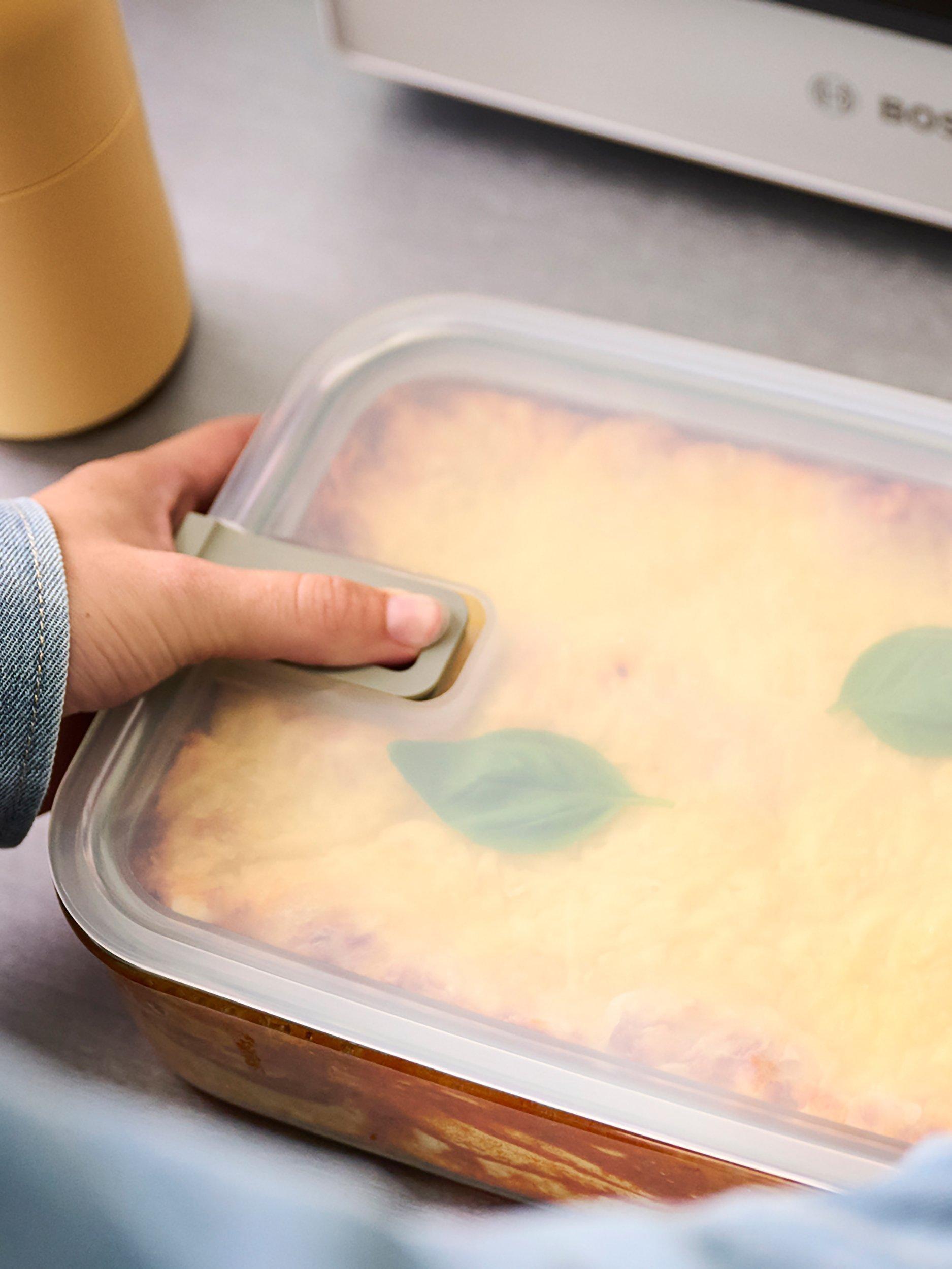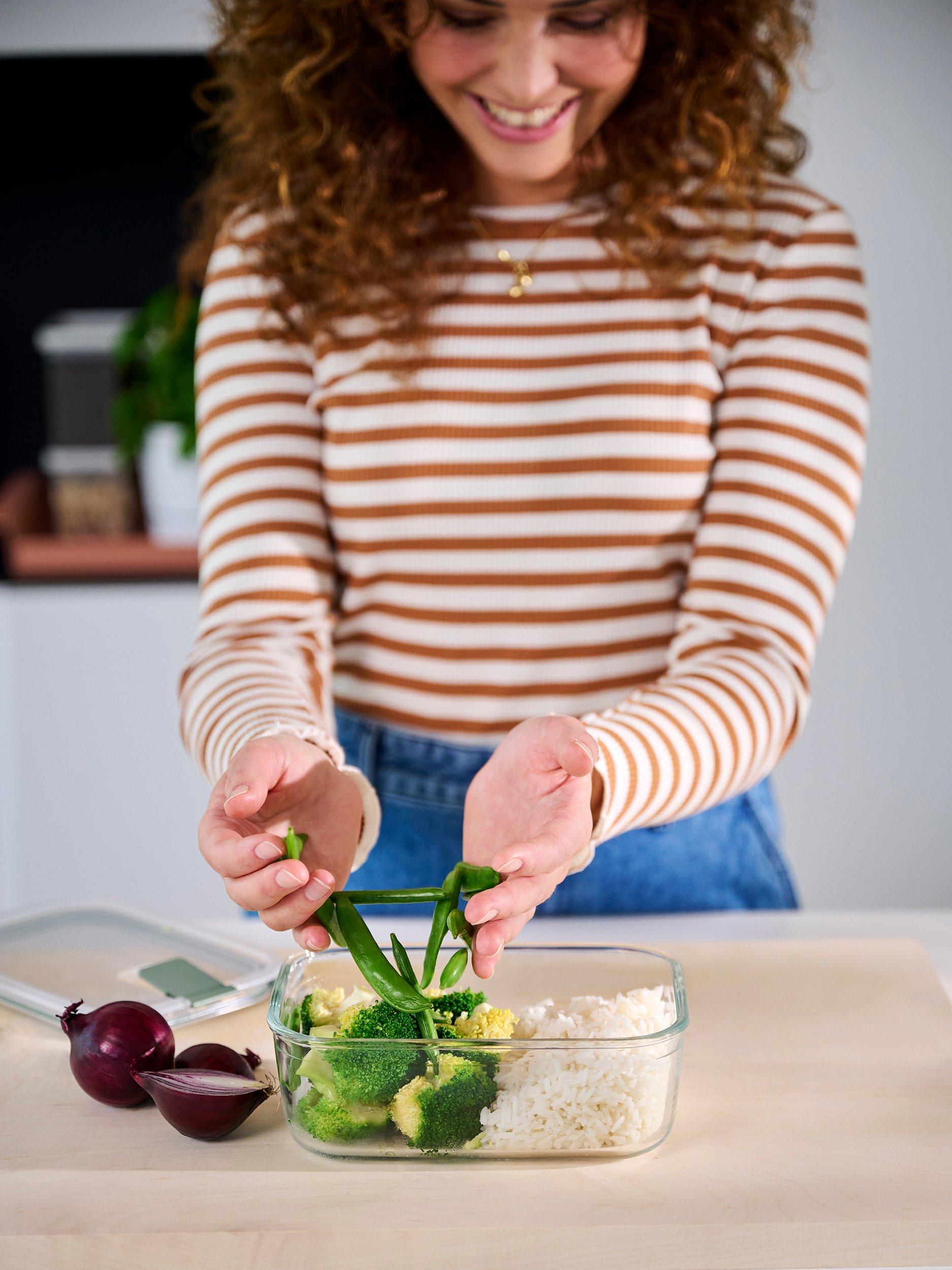 Store leftovers or marinades in the glass dishes. With one click, the glass dish is leak-proof, airtight and aroma-tight. Click, seal and store. Thanks to the design of this storage champion, you will have super sleek organisation in your fridge or freezer. And because of the transparent lid and dish, you can see the contents at a glance.