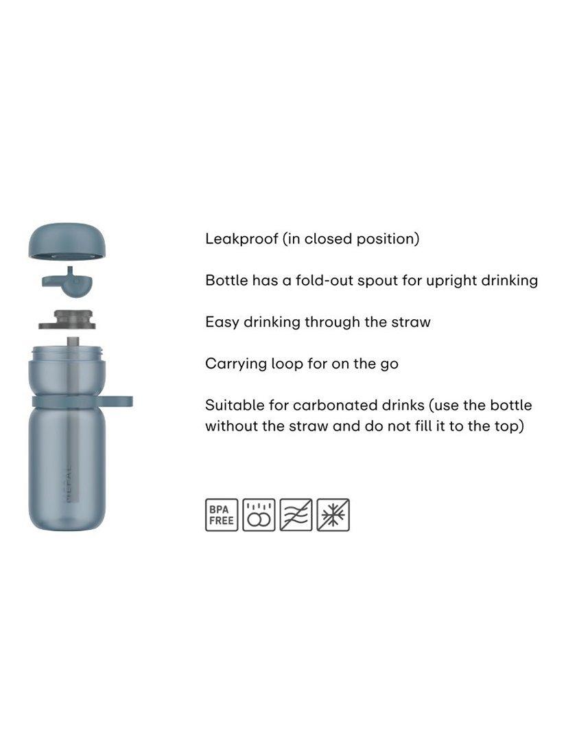 The Flip from Mepal is a leak-proof drinks bottle with a flip valve and straw for comfortable drinking. Equipped with a handy carrying loop, it's dishwasher-safe for easy and hygienic cleaning. The cap of this bottle is also suitable for Mepal's Squeeze and Shake bottles. Made in the Netherlands from BPA-free materials.