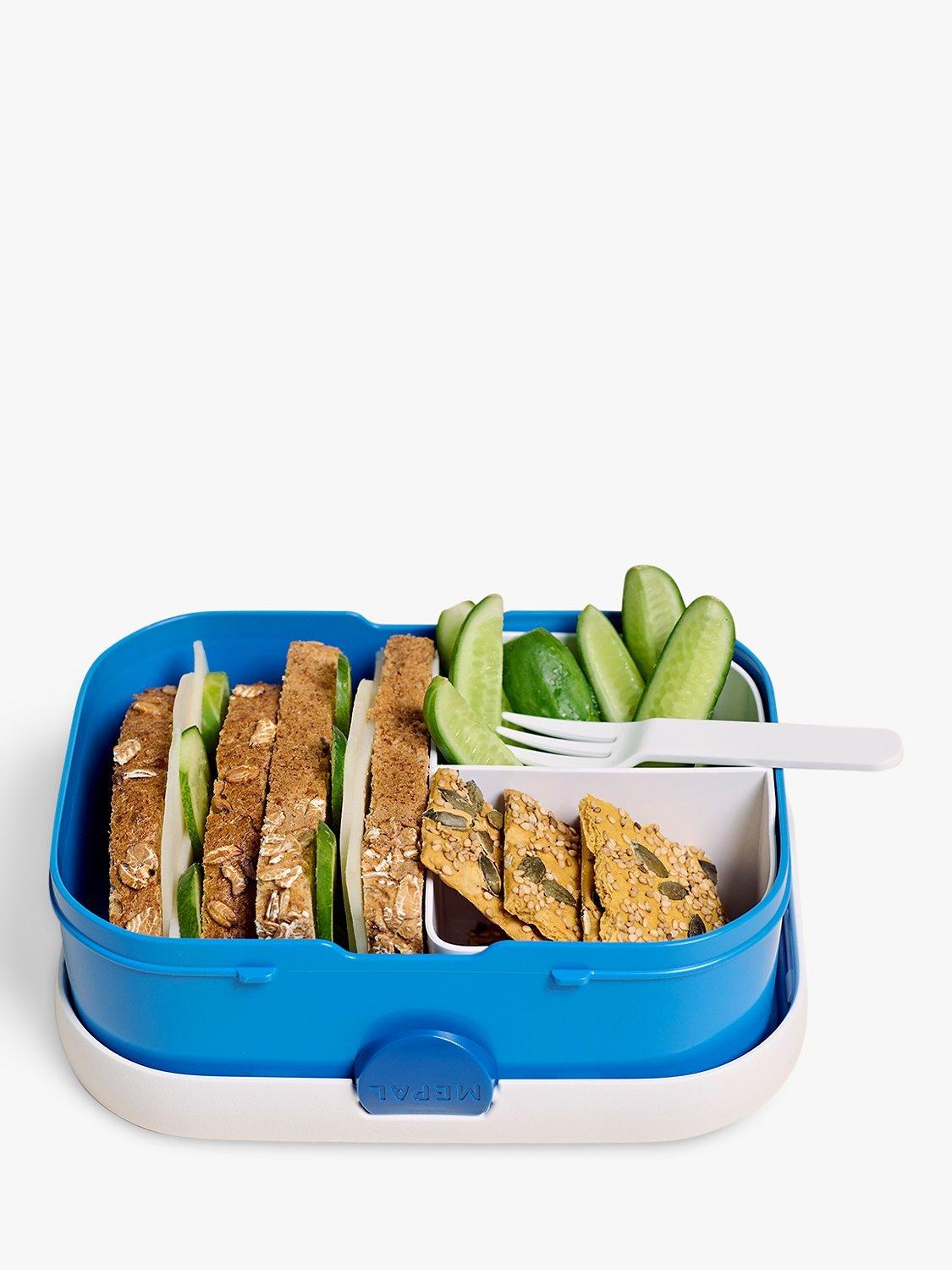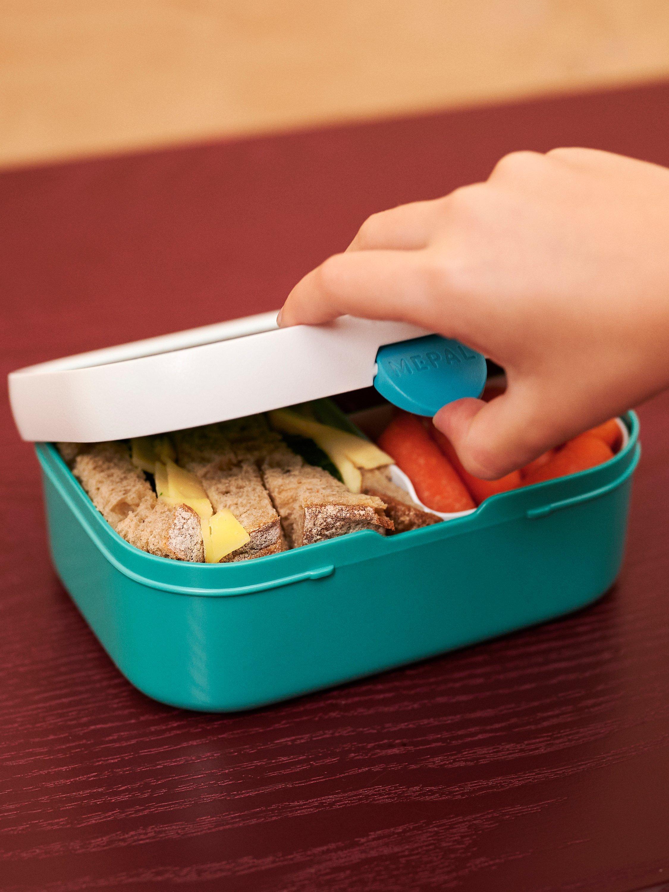 This lunch box makes child's play of creating fun and varied lunches. It holds up to four slices of bread easily, and it comes with a bento tray and a little fork so you can add an endless variety of extras. Made by Mepal in the Netherlands. 100% BPA-free plastic.