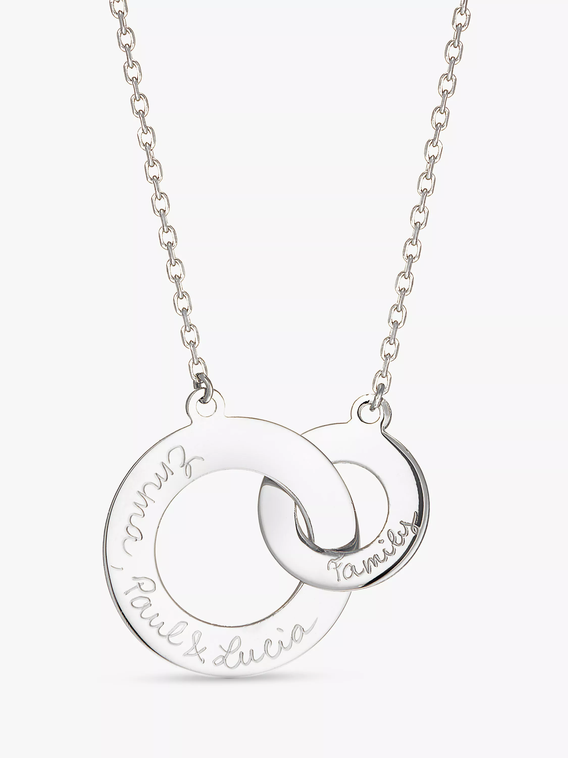 This delightful necklace from Merci Maman features two circular, intertwined charms that can be personalised.