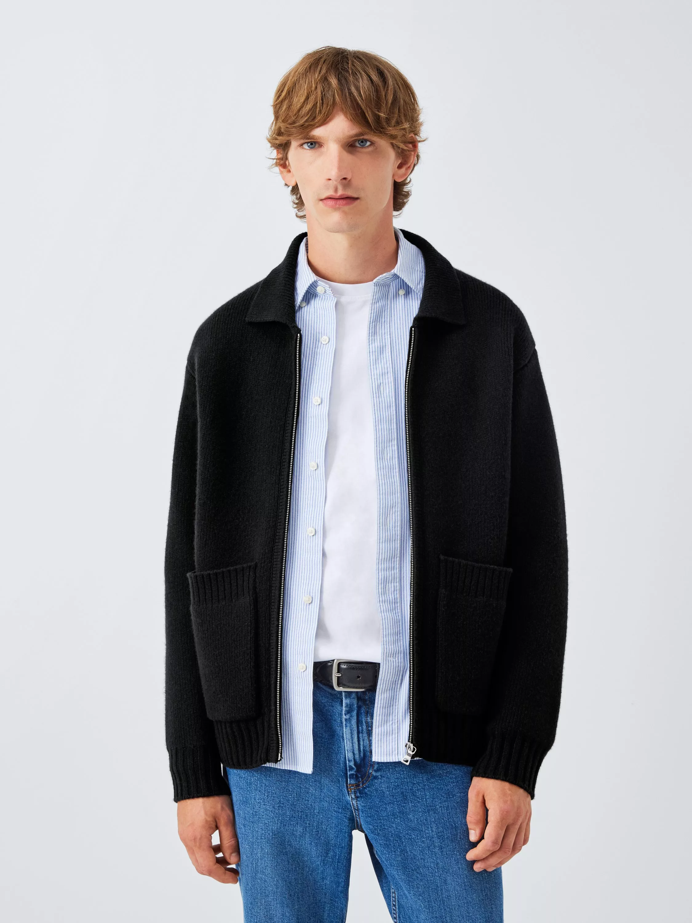 Zip-through jacket made of a warm merino wool blend knit with cashmere for a soft and luxurious touch. Styled with two large front patch pockets with a ribbed knit on the collar, hem and cuffs.